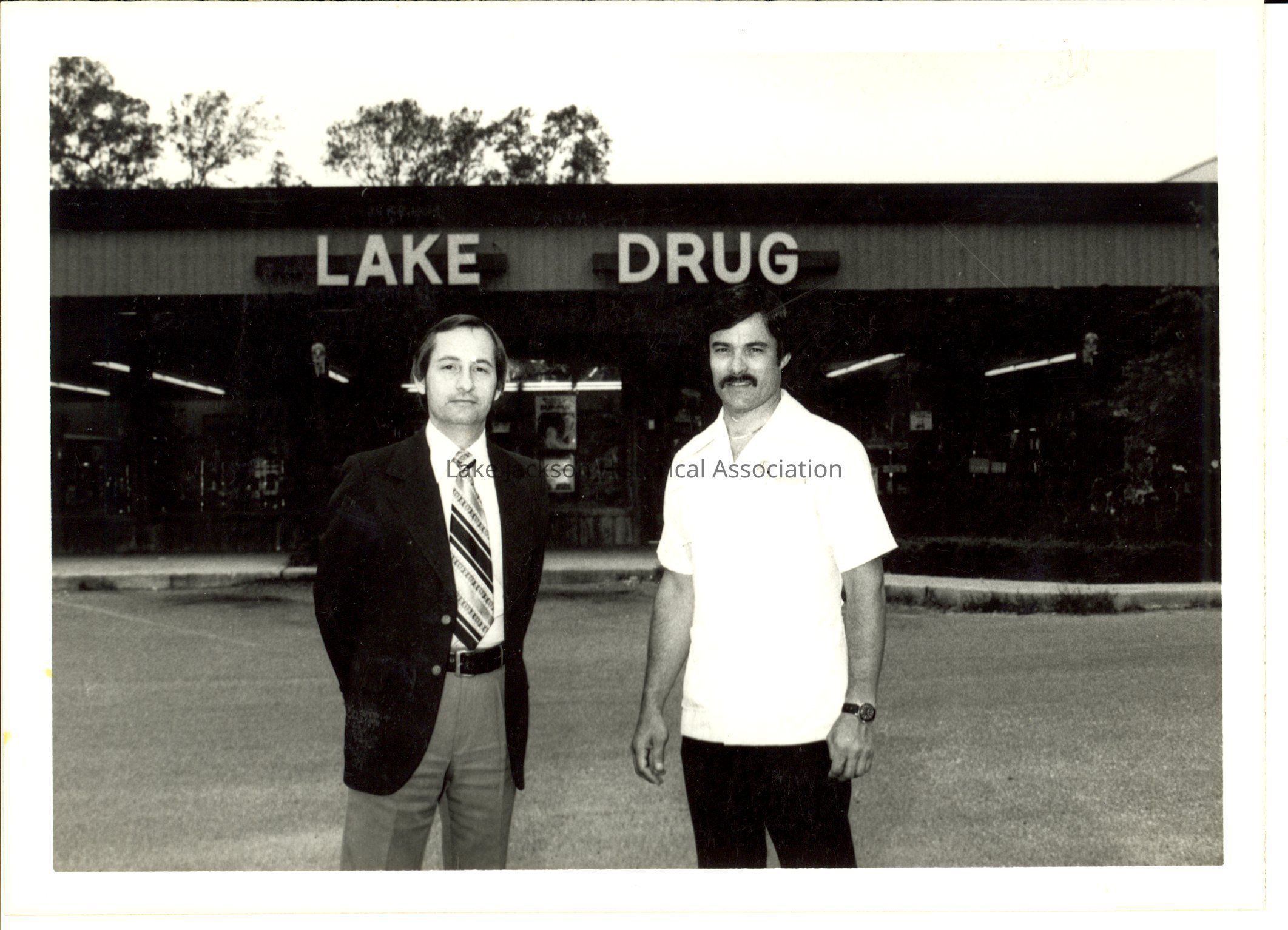 1- Black and white photo of a man standing outside of Lake Drug with George Harris. George is the one in white.Collection