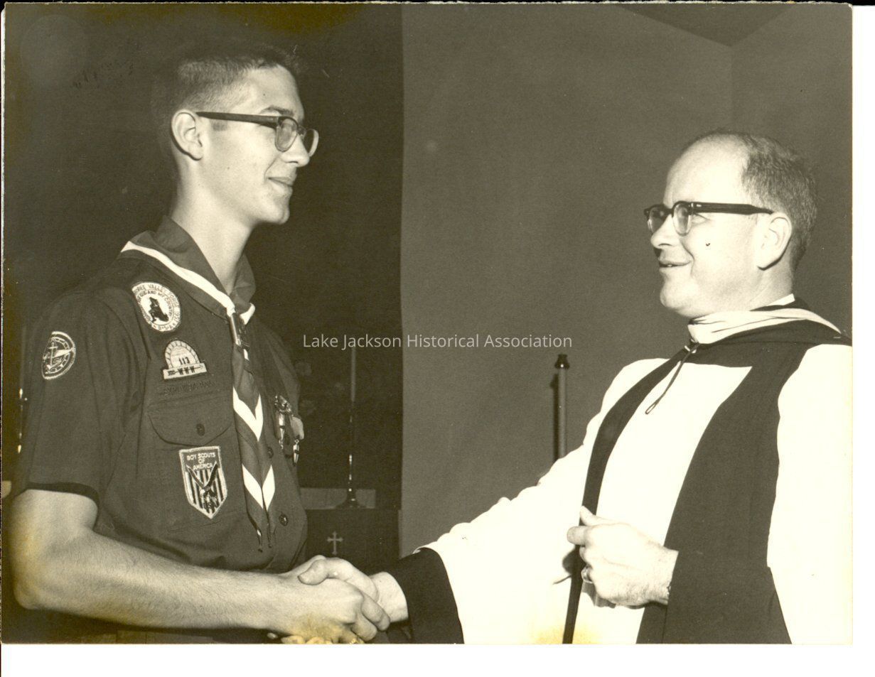 1- Black and white photo of a Explorer- Sea Scout, shaking hands with a man in a robe.