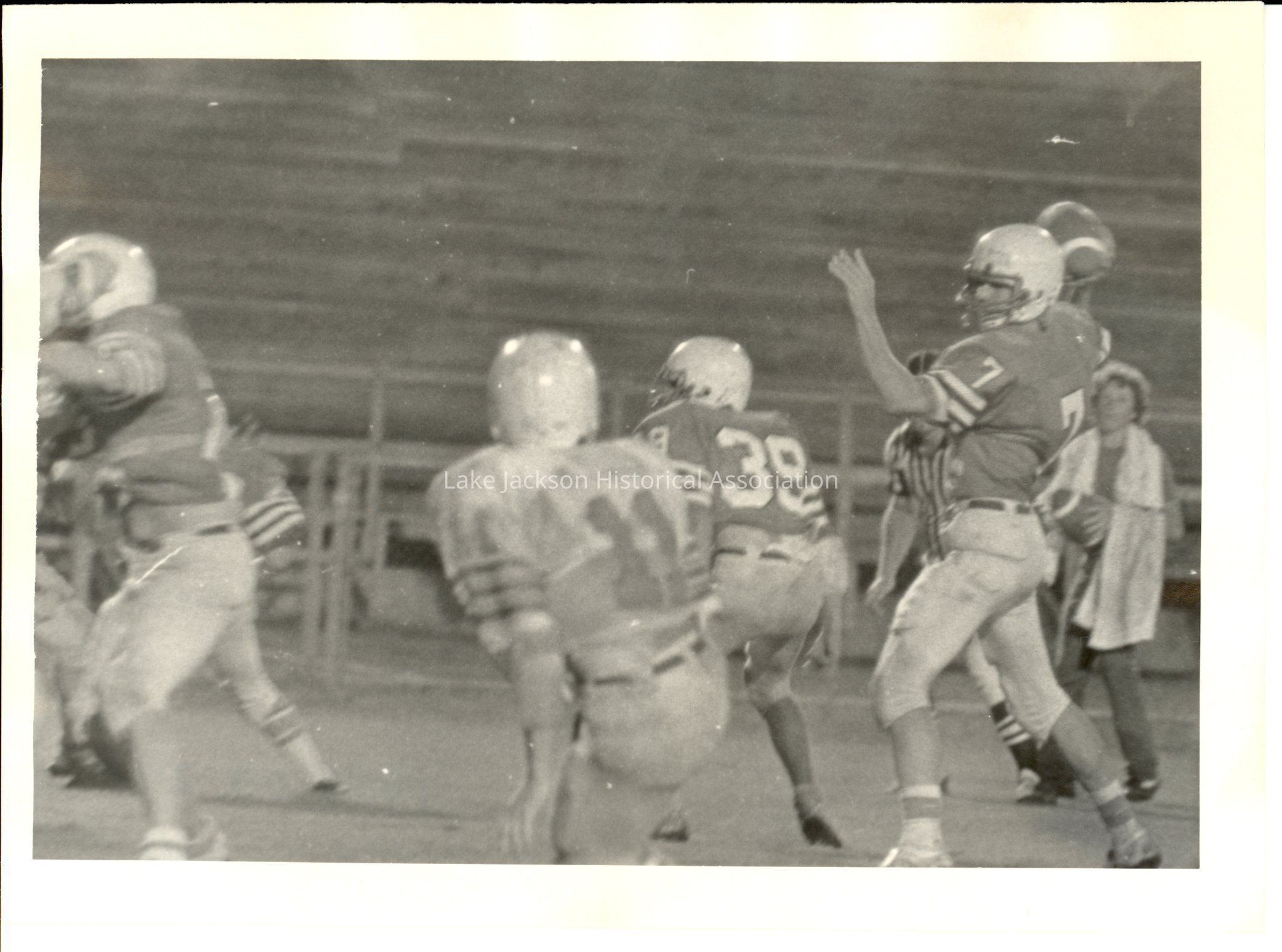 1- Black and white photo of football players during a game.