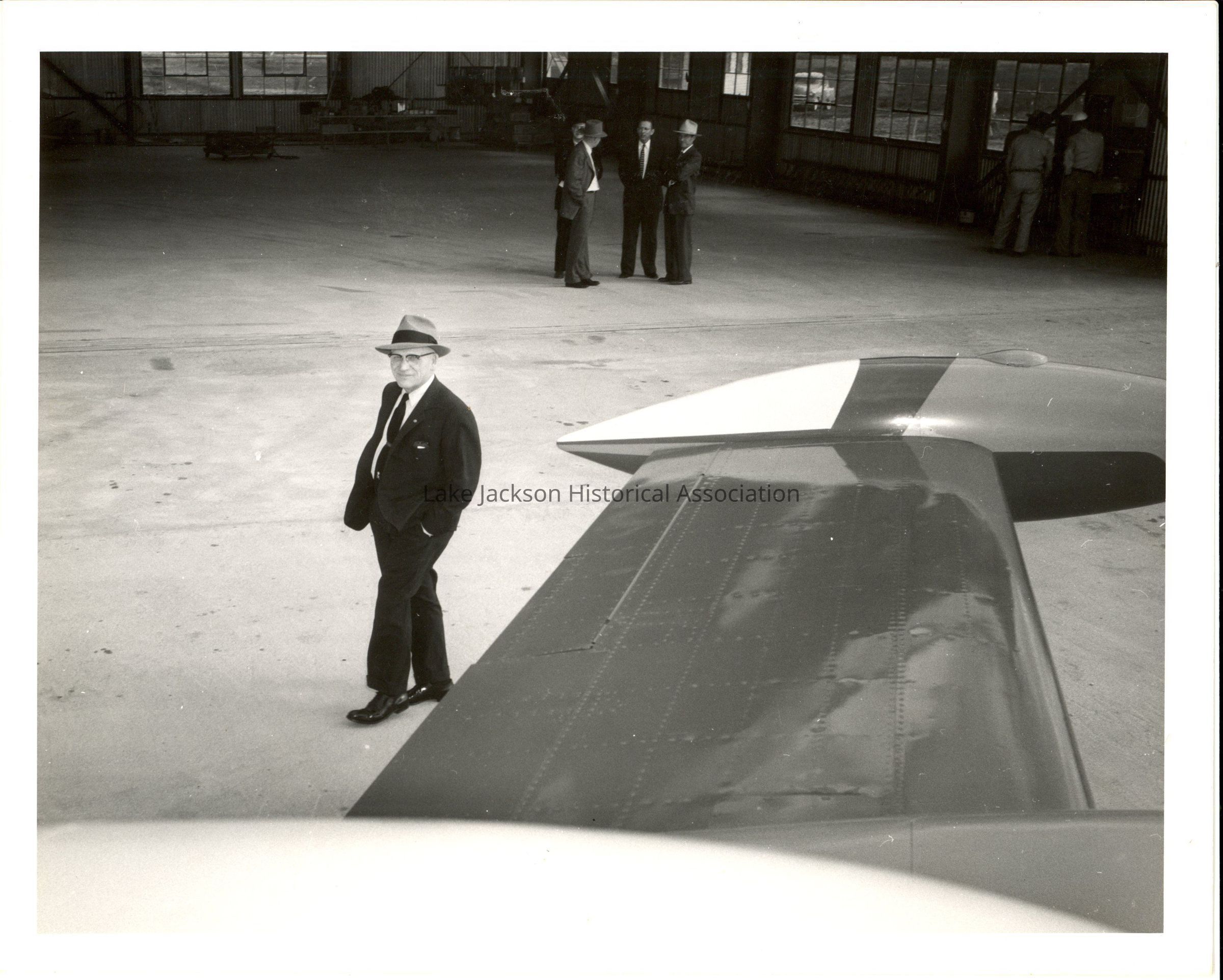 1- Black and white photo of Dr. Beutel standing in front of an airplane wing in an airplane hangar.Collection