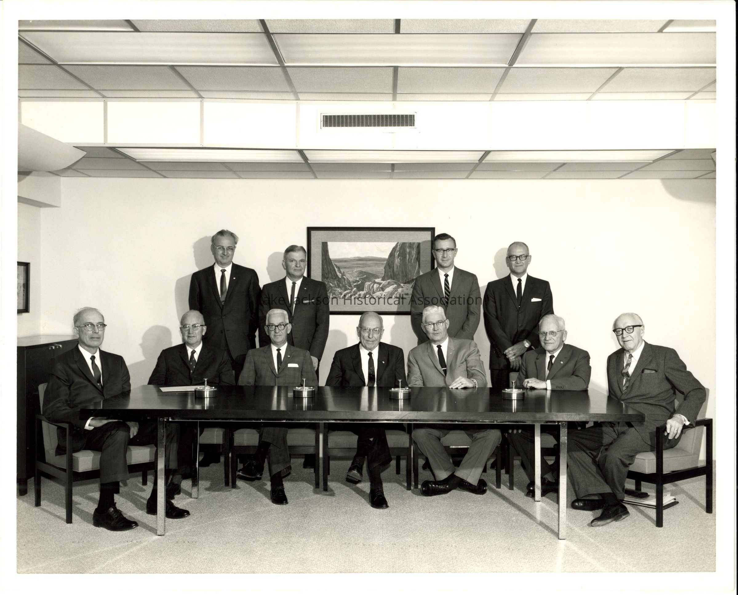 1- Black and white photo of Dr. Beutel with a group of men. Some are sitting at a desk. Tulsa-DowellCollection