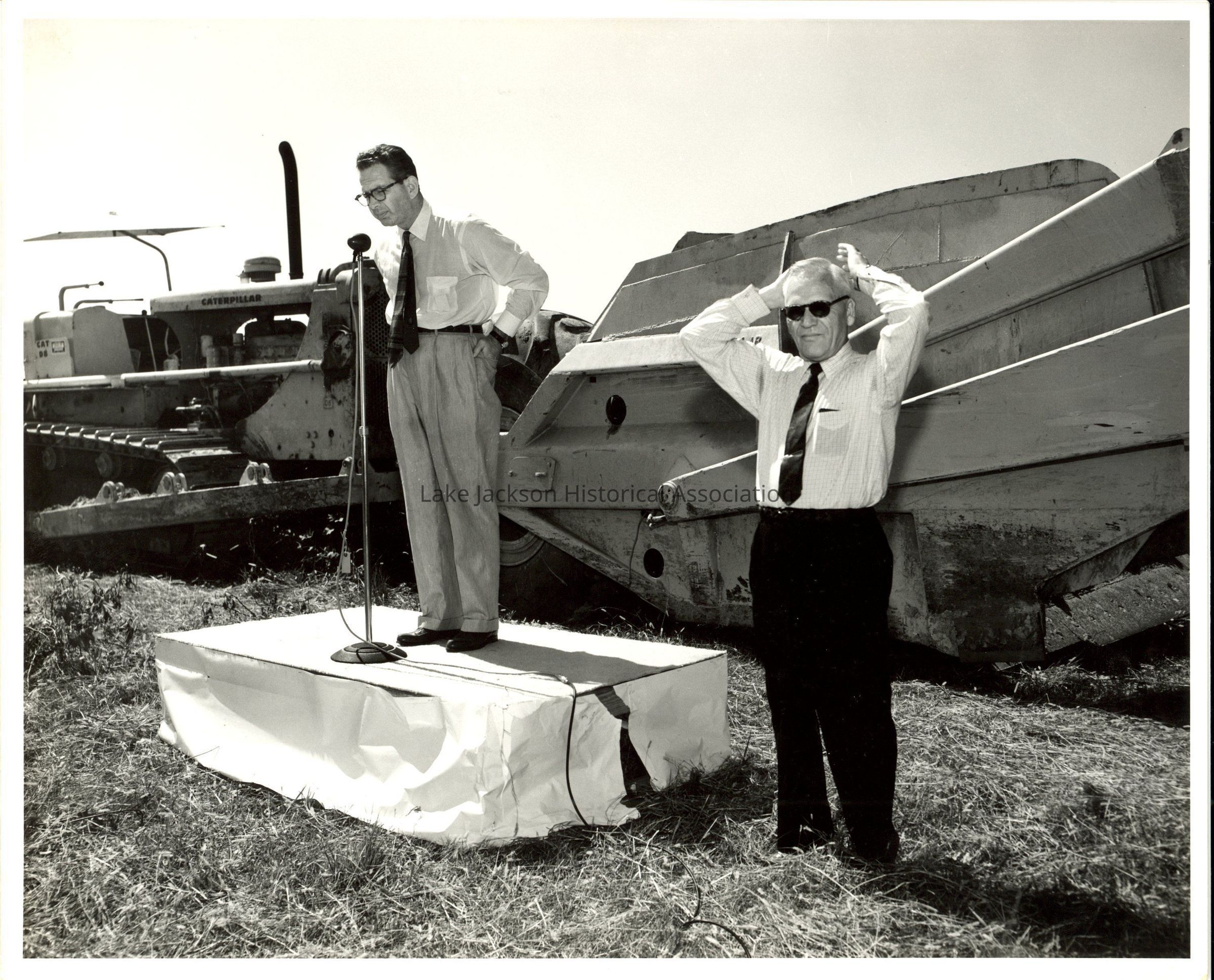 1- Black and white photo of Dr. Beutel standing in front of a Caterpillar machine with another man at the microphone.Collection