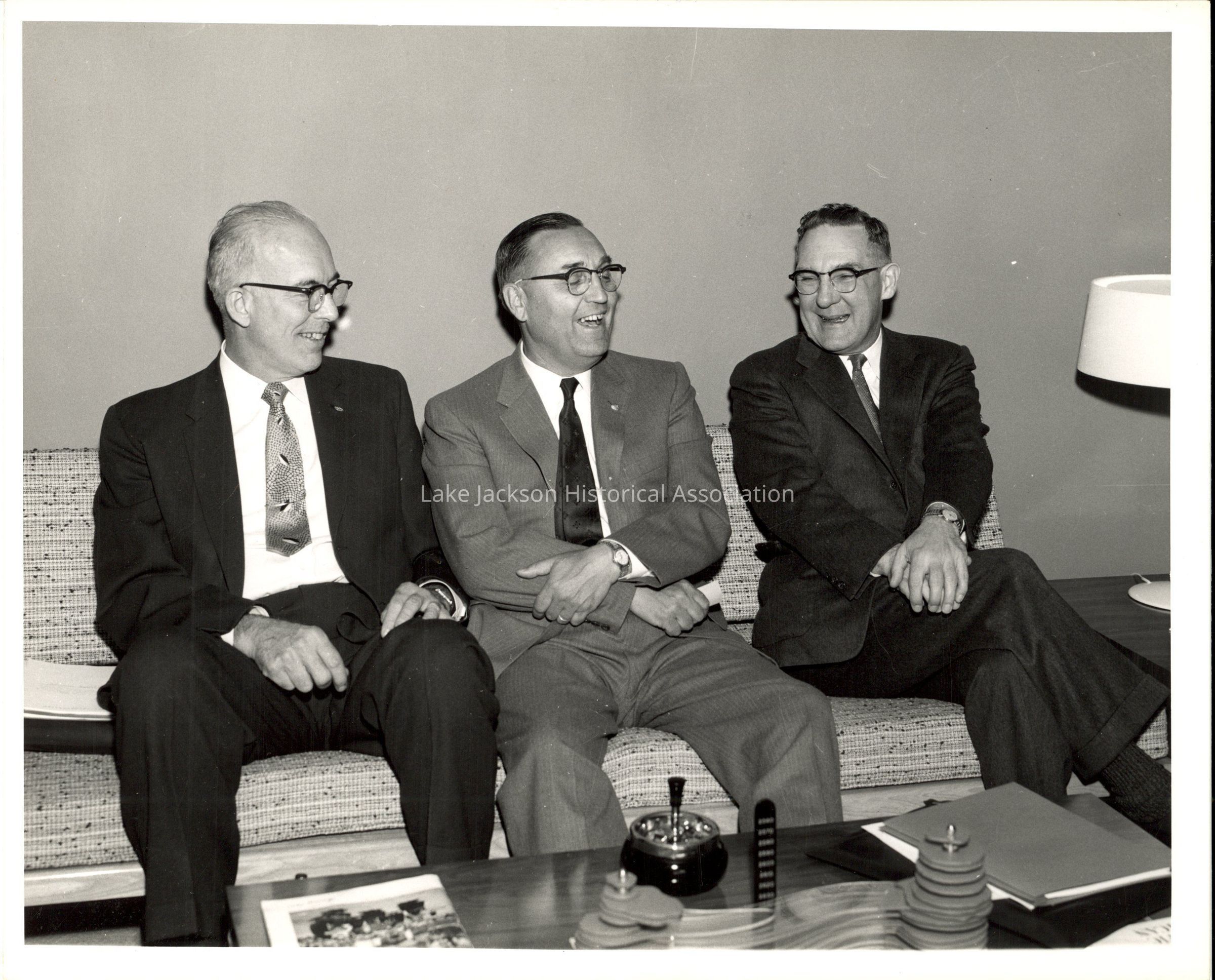 1- Black and white photo of three men sitting on a sofa in an office.Collection
