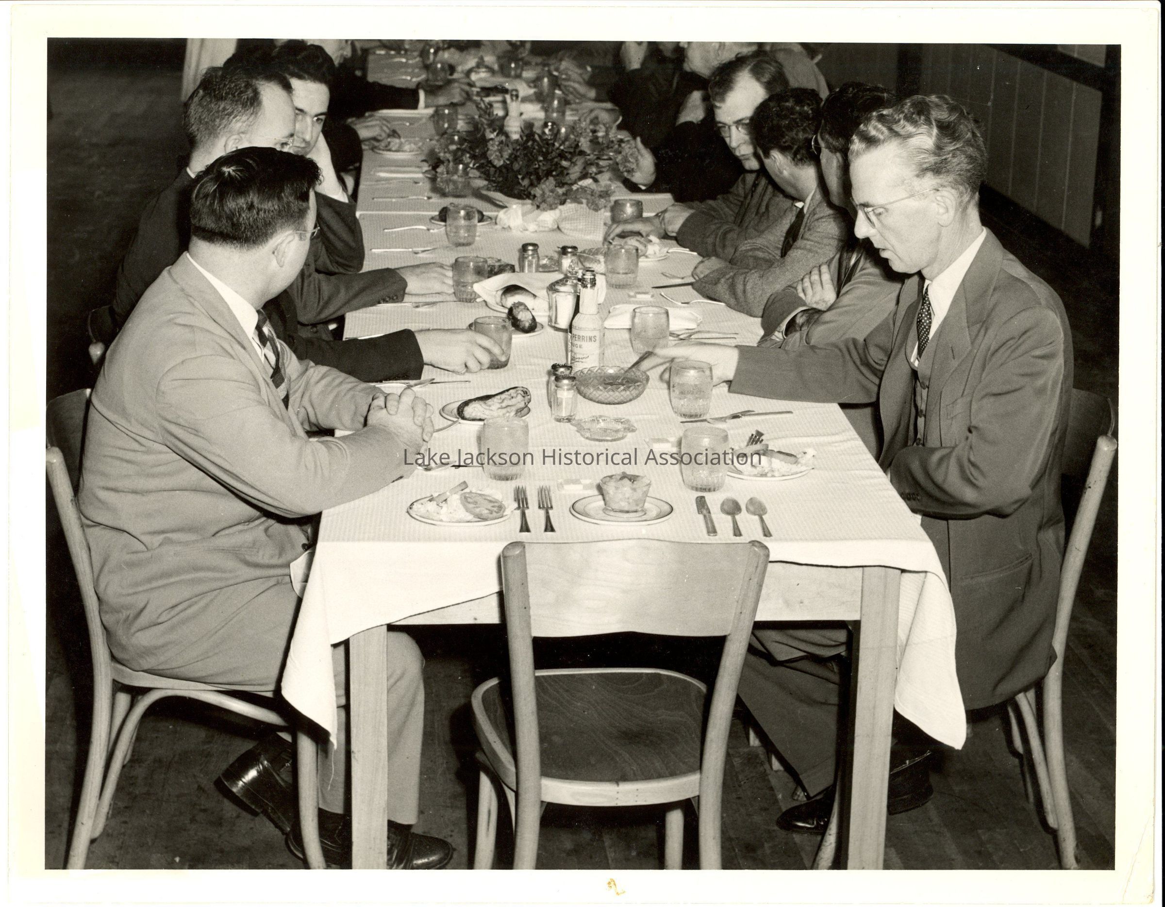 1- Black and white photo of a group of business people at dinner.