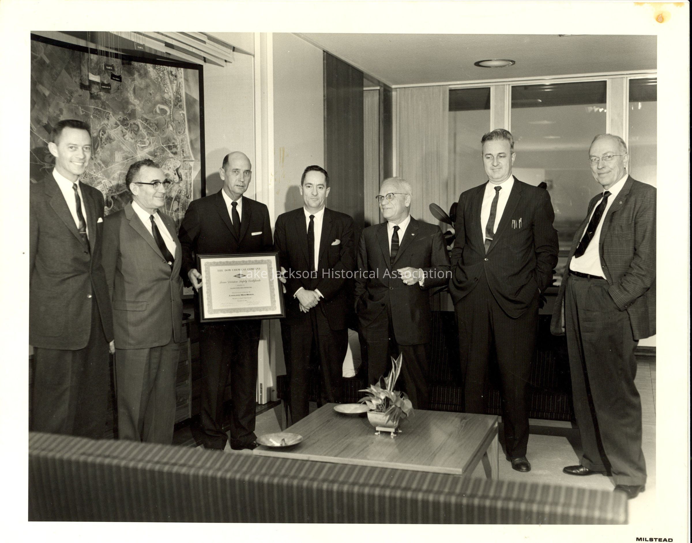1- Black and white photo of Dr. Beutel and a group of men standing in an office. Once man is holding a framed certificate.Collection