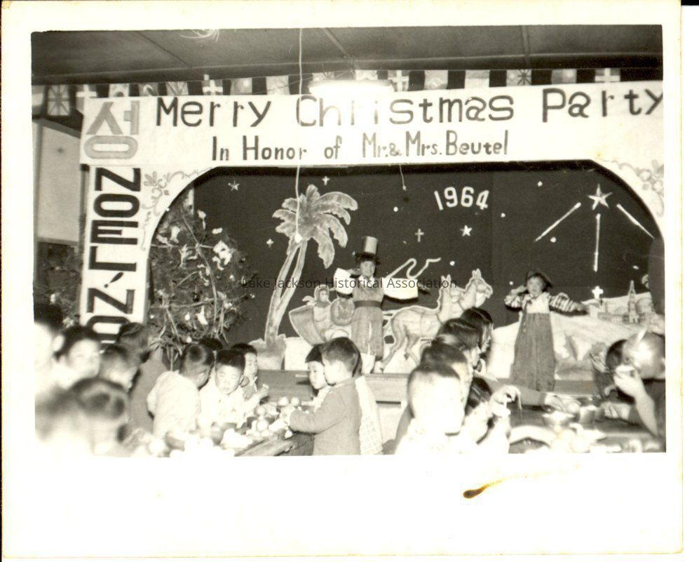 1- Black and white photo of a Christmas party honoring Mr. And Mrs. Beutel. There are children in the photo. 1964.Collection