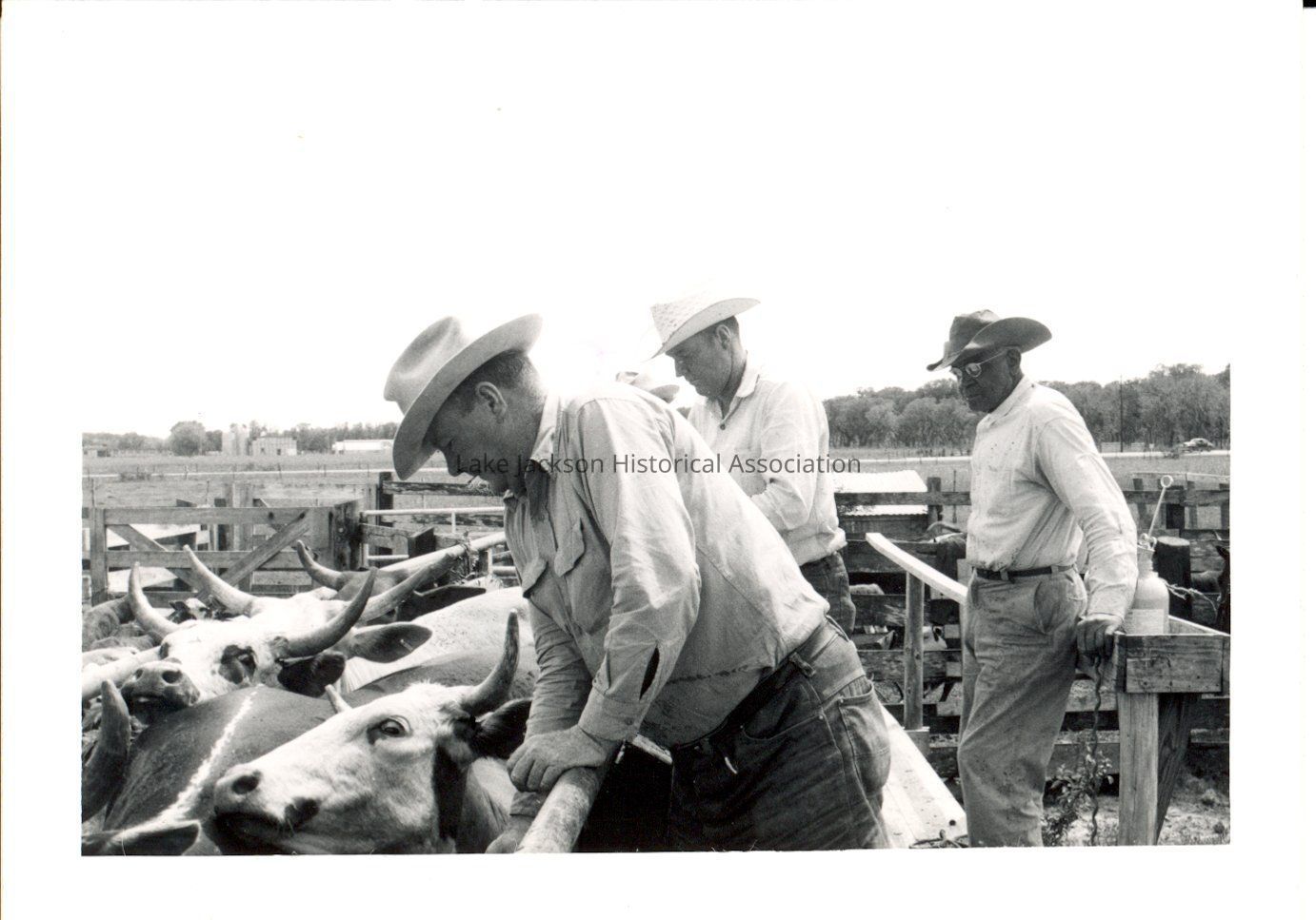 1- Black and white photo of three men tending to cattle in a pen.Collection