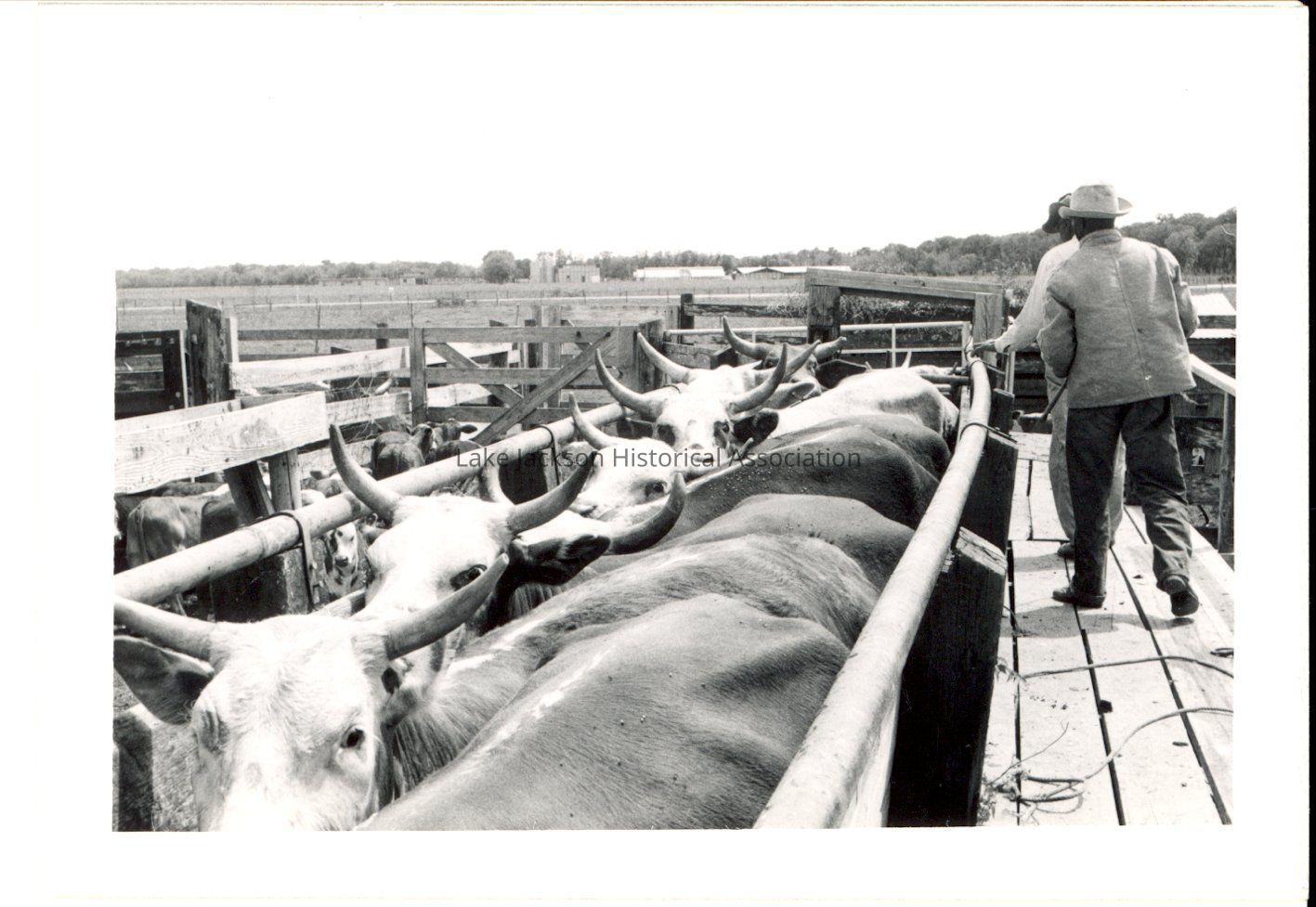 1- Black and white photo of two men walking on a plank beside a pen with cattle in it.Collection