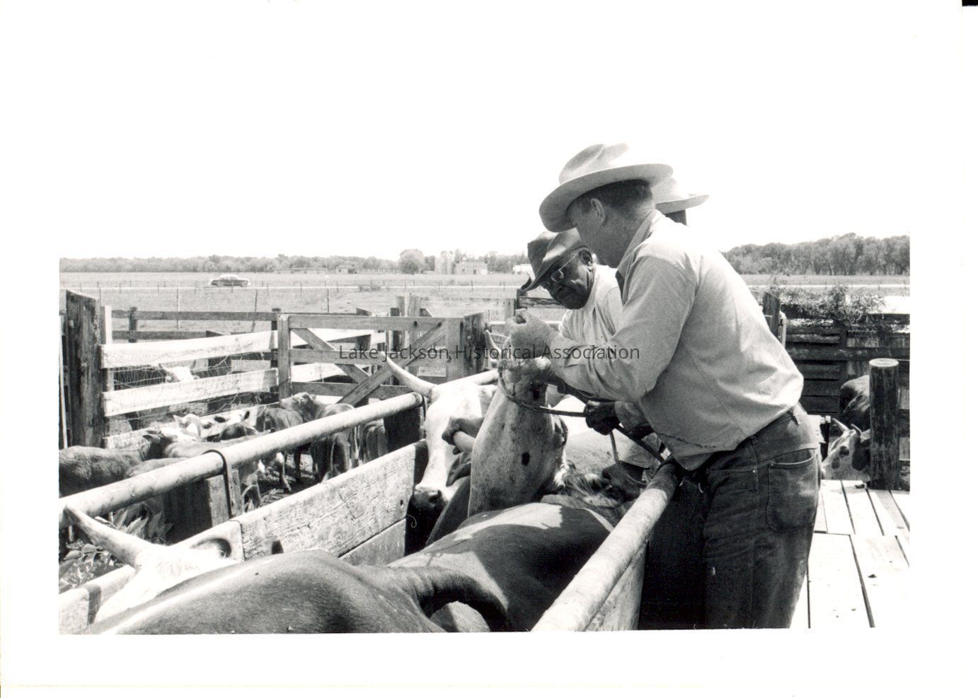 1- Black and white photo of two men tending to cattle in a pen.Collection