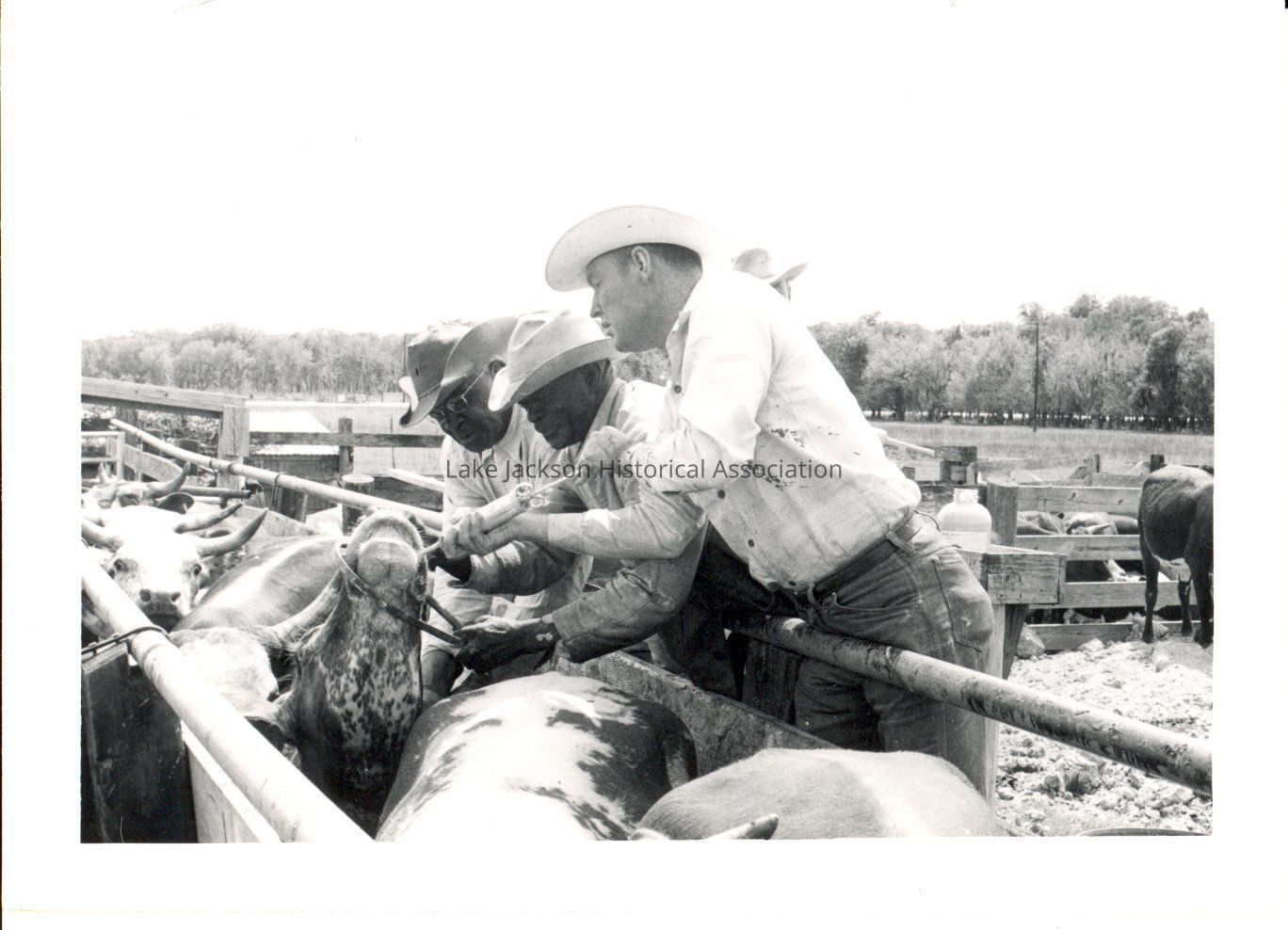 1- Black and white photo of three men giving medicine to cattle in a pen.Collection
