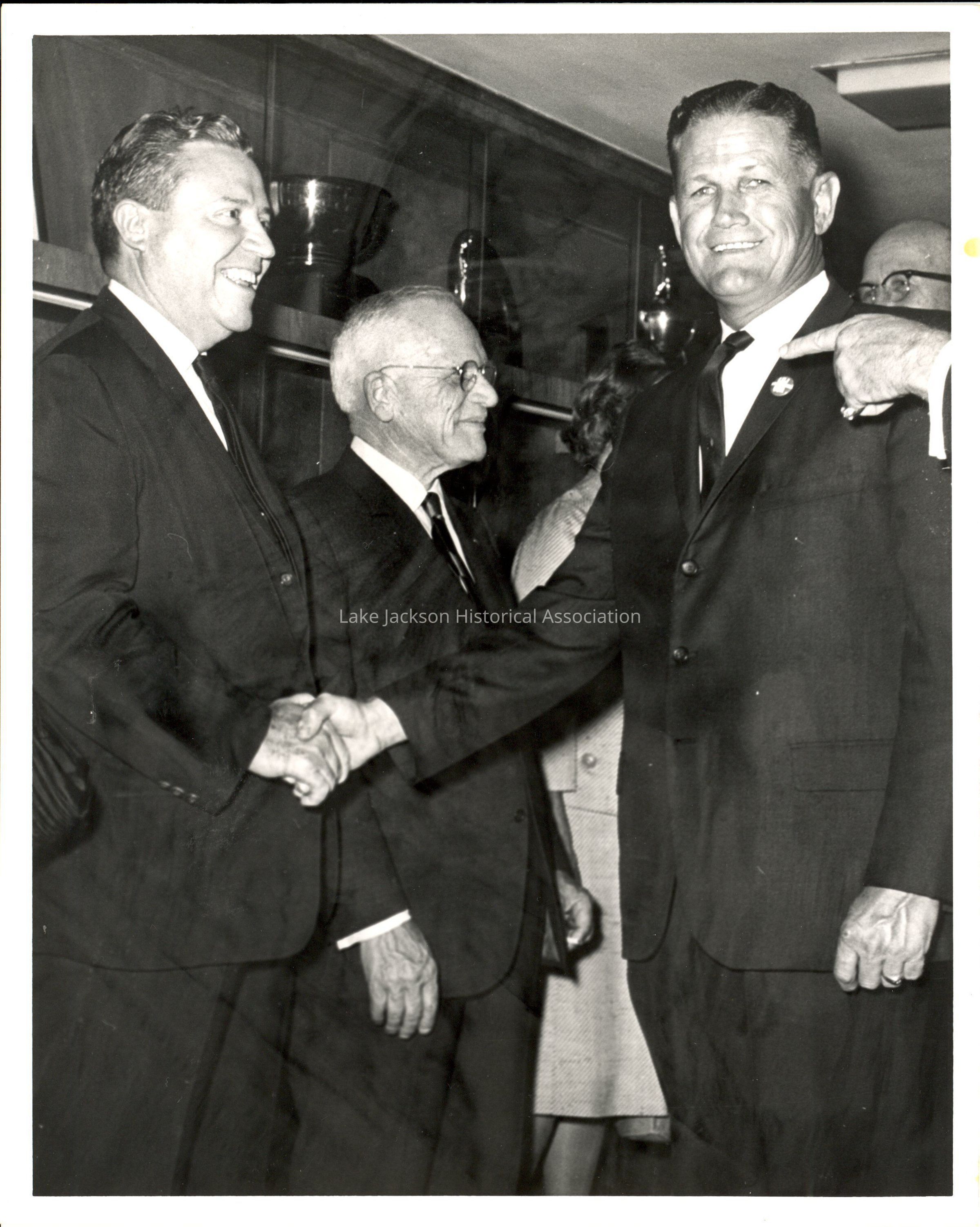 1- Black and white photo of two men shaking hands with Dr. Beutel standing behind them.Collection