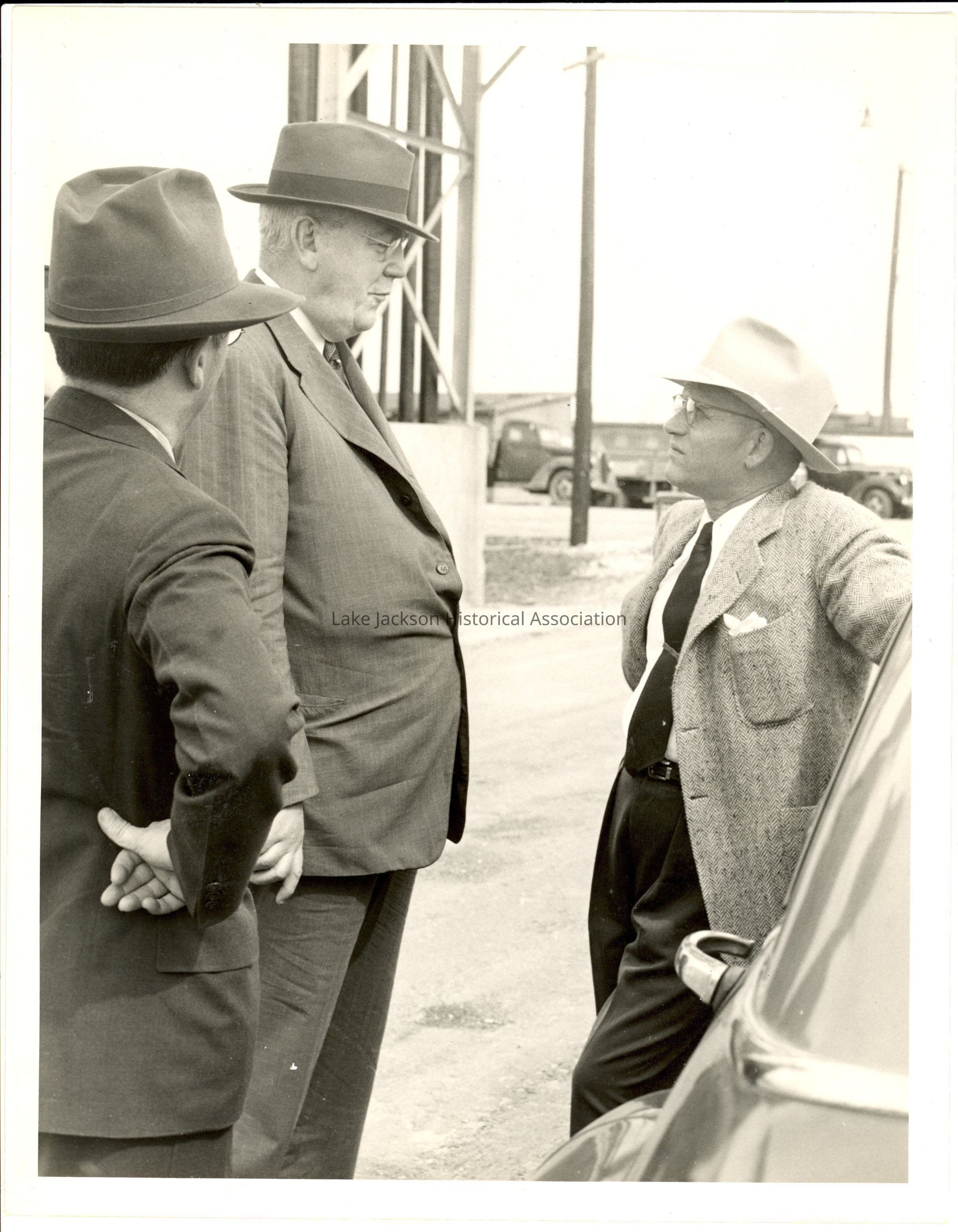 1- Black and white photo of Dr. Beutel talking to two men standing by a car.Collection