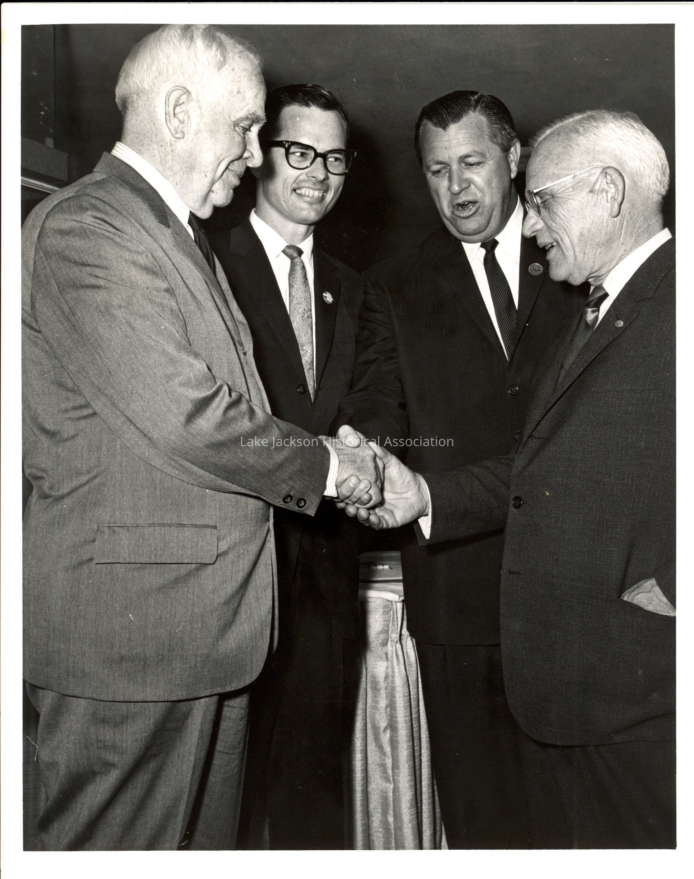 1- Black and white photo of Dr. Beutel shaking hands with a man while two others look on.Collection