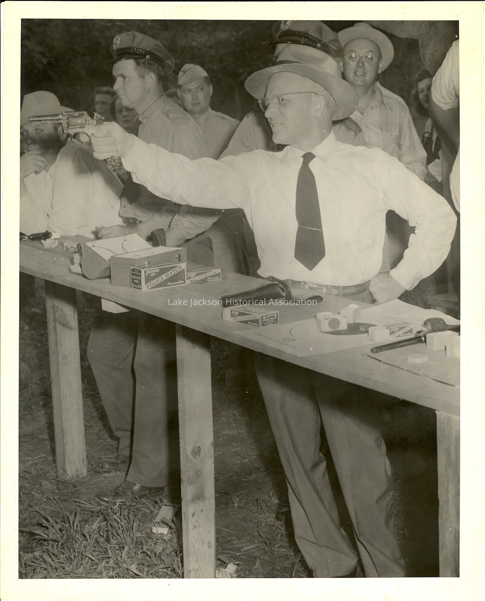 Black and white photo of Dr. Beutel shooting a gun at a Dow Safety Barbeque.Collection