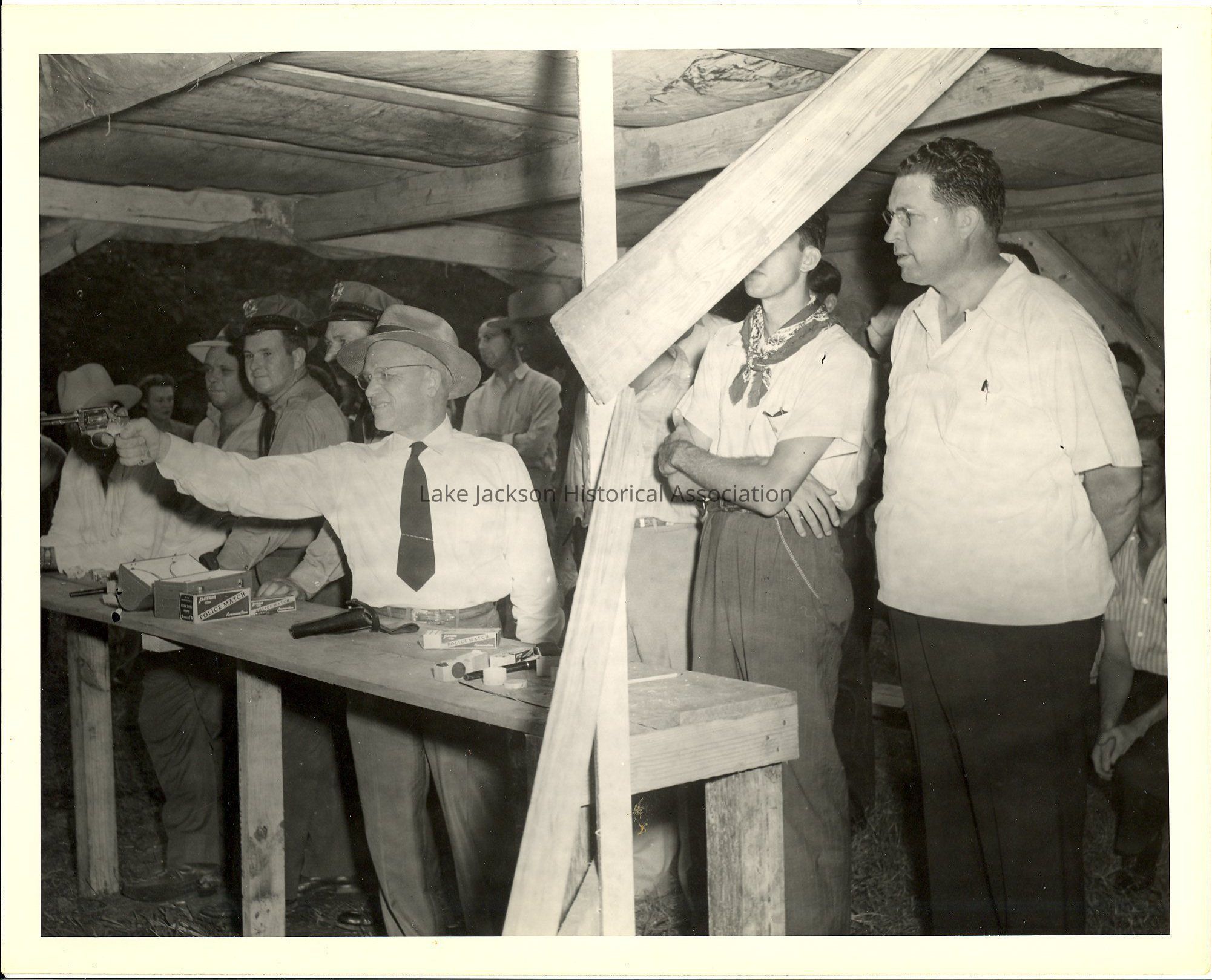 Black and white photo of Dr. Beutel shooting a gun at a Dow Safety Barbeque.Collection