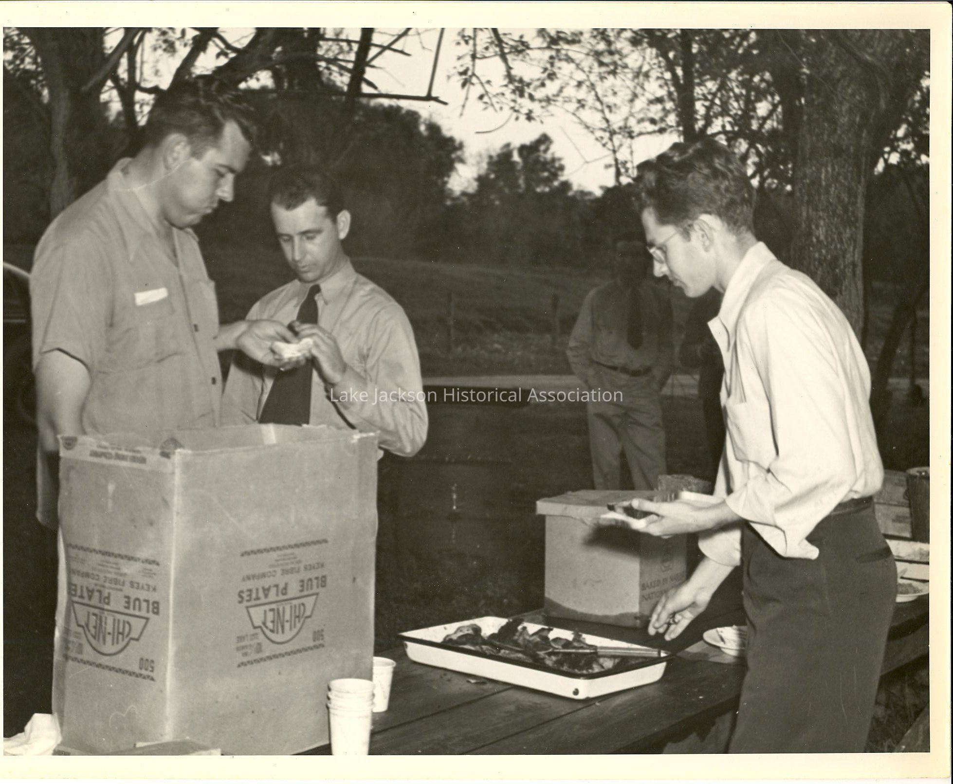 Black and white photo of a few men at a picnic event.
