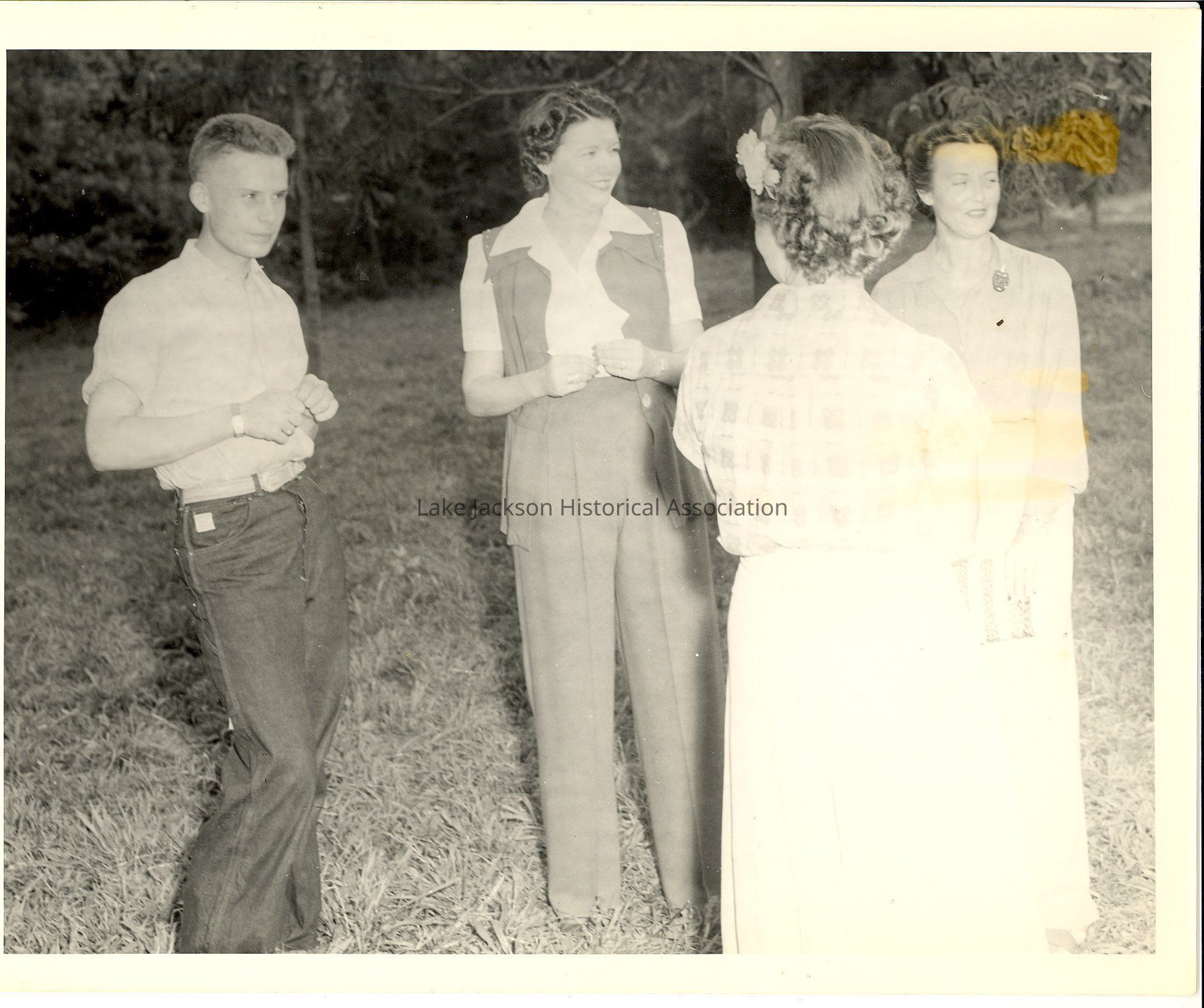 Black and white photo of Belle Beutel with two unknown women and unknown man outside.Collection