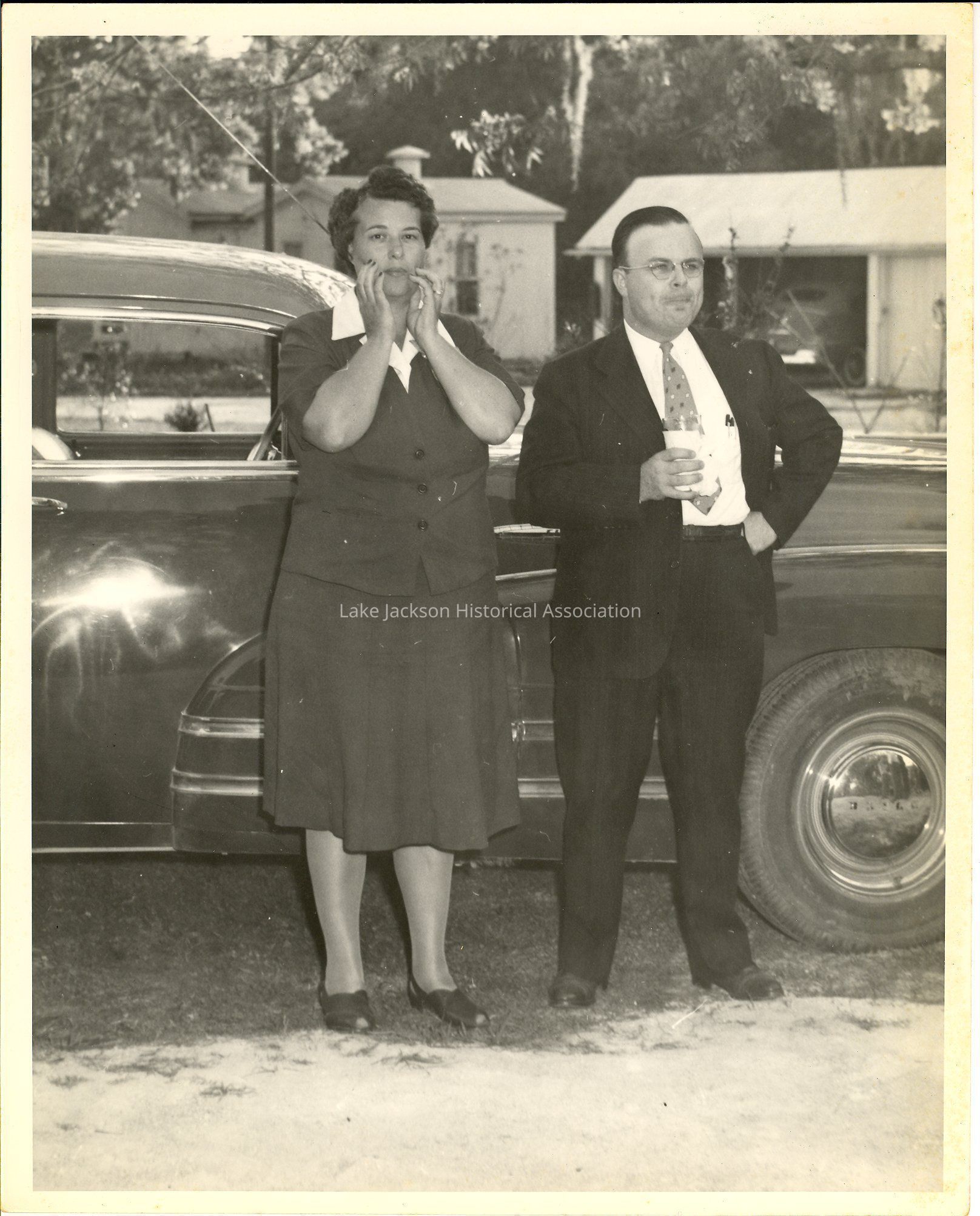 Black and white photo of Bill and Sena Colegrove standing in front of a car.Collection