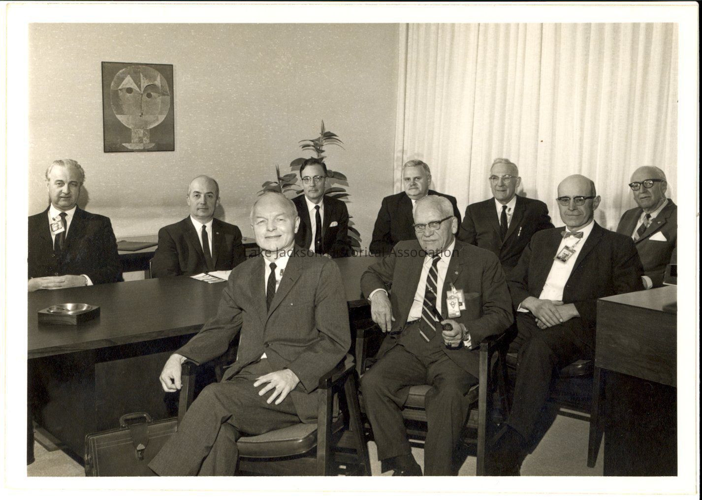 Black and white photo of Dr. Beutel and group of men sitting around a table.Collection