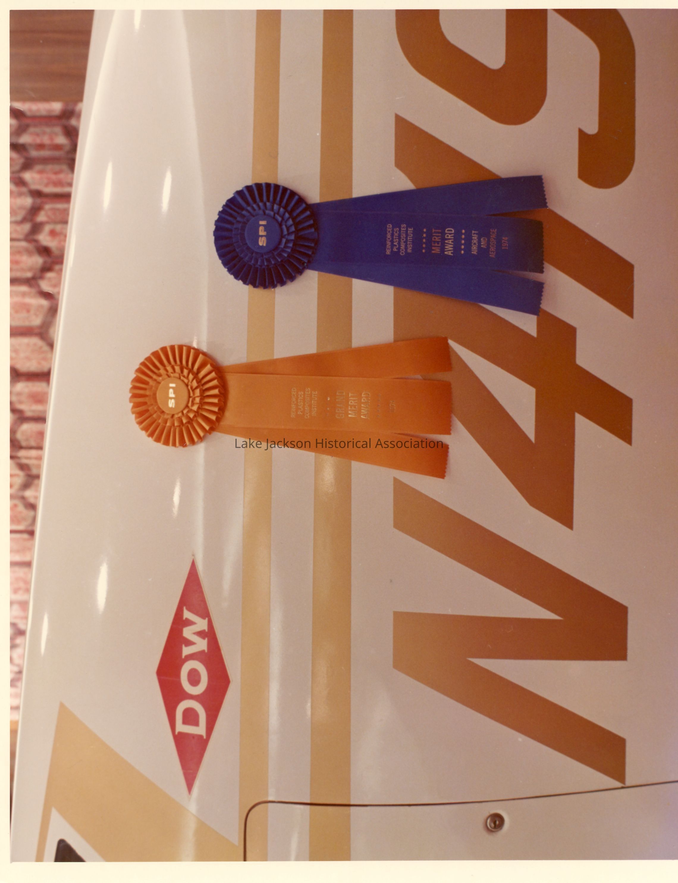 Color photo of Windecker Eagle with yellow and blue ribbons. Ribbons say, yellow-"Reinforced Plastics Composites Institute Grand Merit Award 1974", blue-"Reinforced Plastics Composites Institute Merit Award Aircraft and Aerospace 1974".Collection
