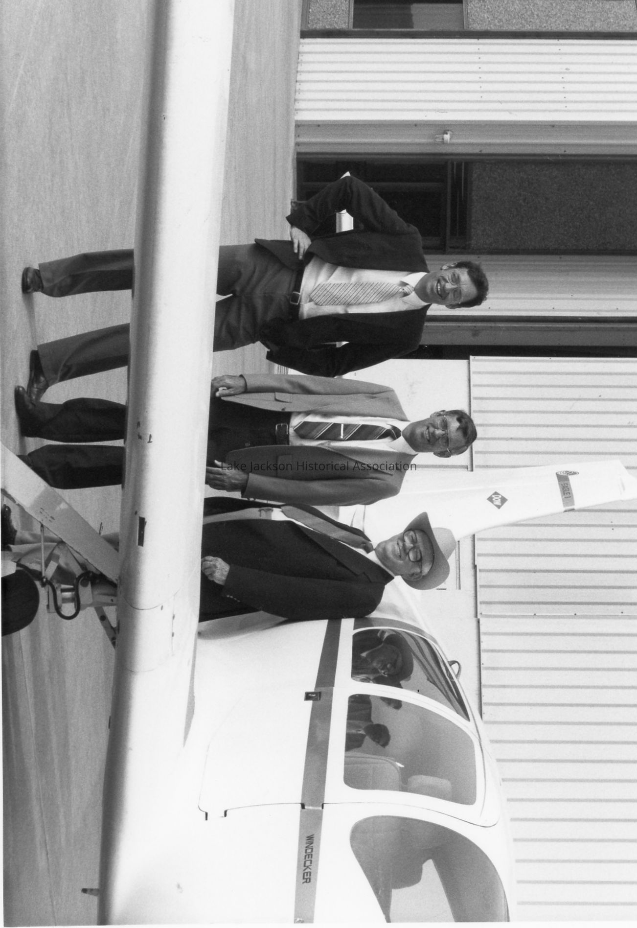 Black and white photo of (from left to right) Tom Hairston, Frank Hale, and Bill Lowrey standing in front of a Windecker Eagle.