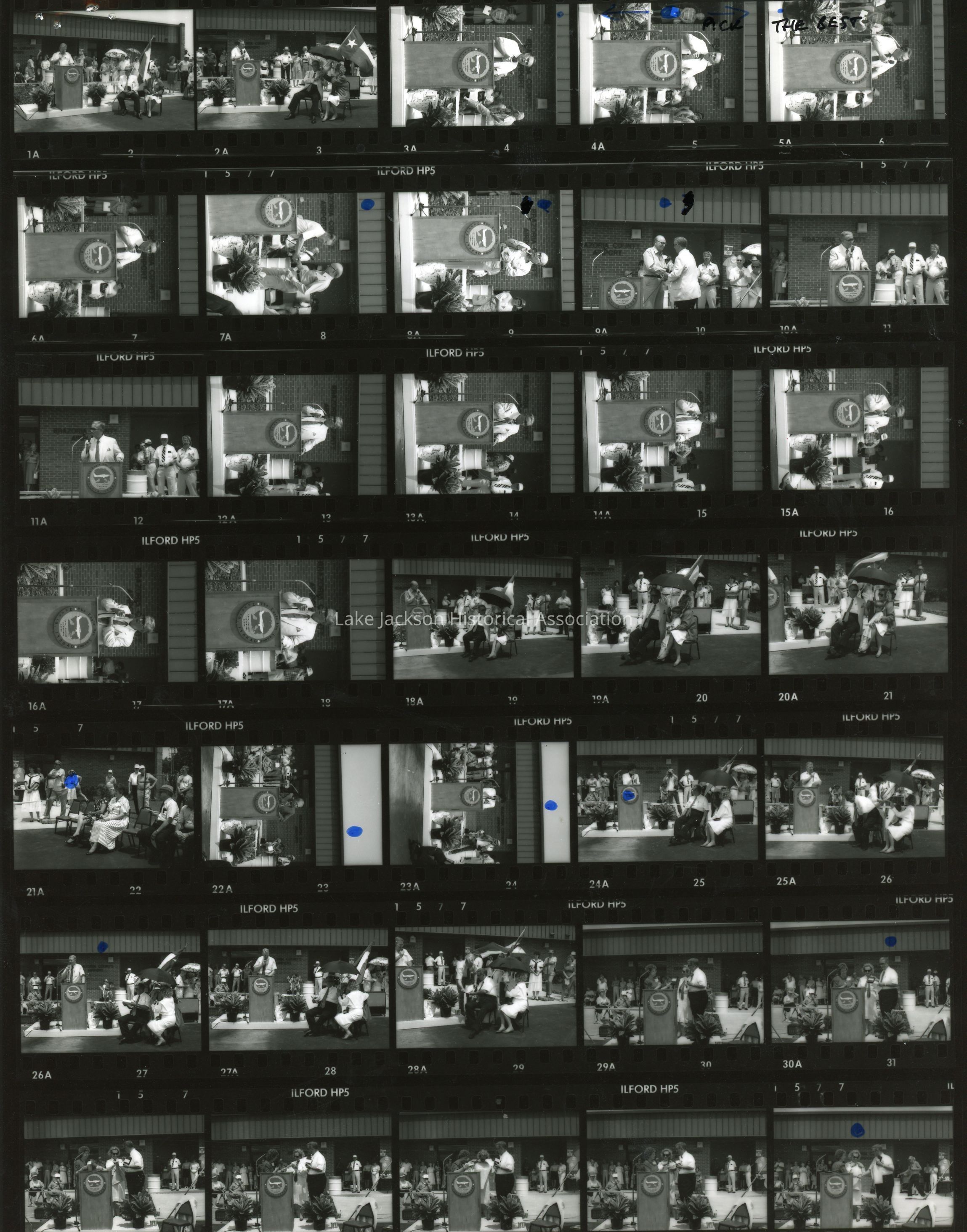 Black and white photo copy of a sheet of negatives with various photographs taken during the donation of the Windecker Eagle (N4195G) to the Lake Jackson Historical Association held at the Brazoria County Airport.Collection