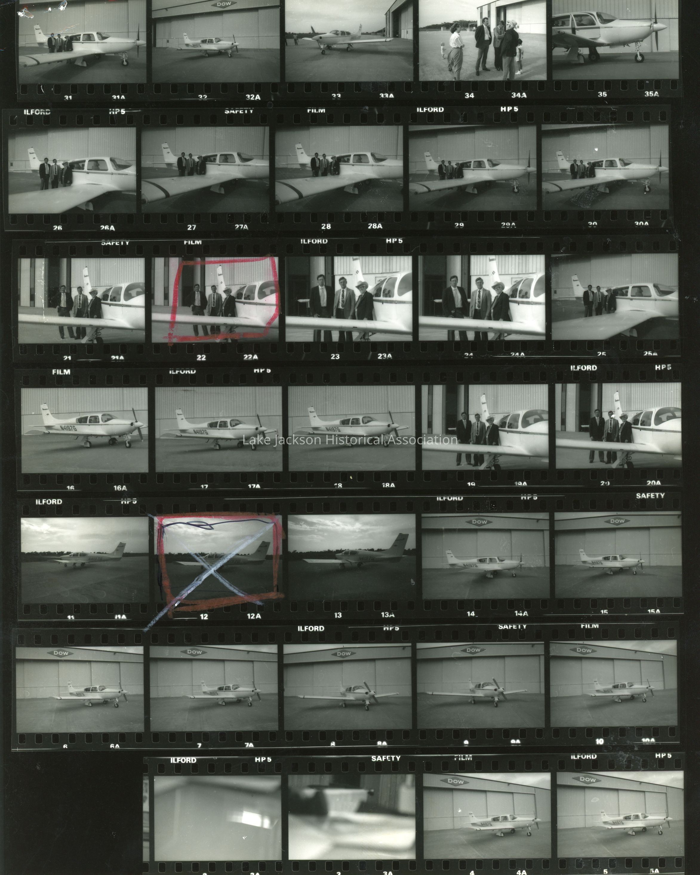 Black and white photo copy of a sheet of negatives with various photographs taken during the donation of the Windecker Eagle (N4195G) to the Lake Jackson Historical Association held at the Brazoria County Airport.Collection