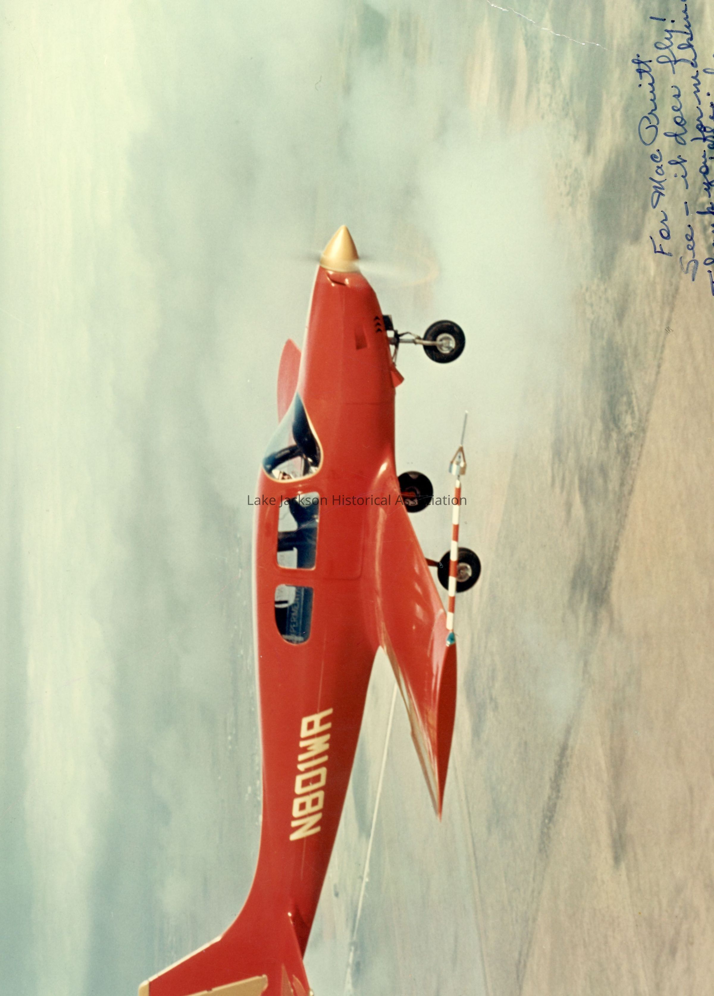 The N801WR Windecker Eagle in flight. Written at bottom of picture is following: "For Mac Pruitt--See-it does fly! Thank you for making it possible. Leo Windecker".Collection