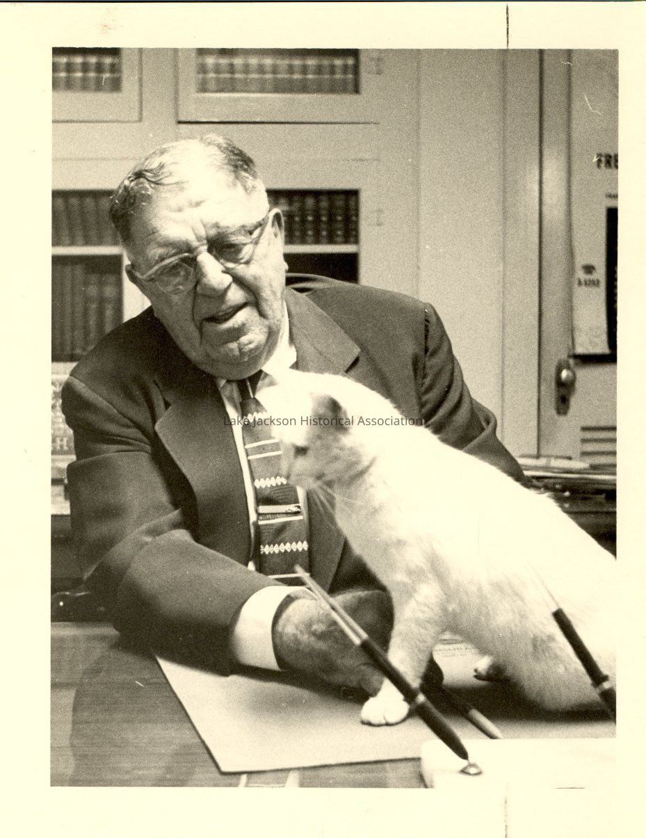 B&W Photo of Y. C. Hardman with white cat on desk.