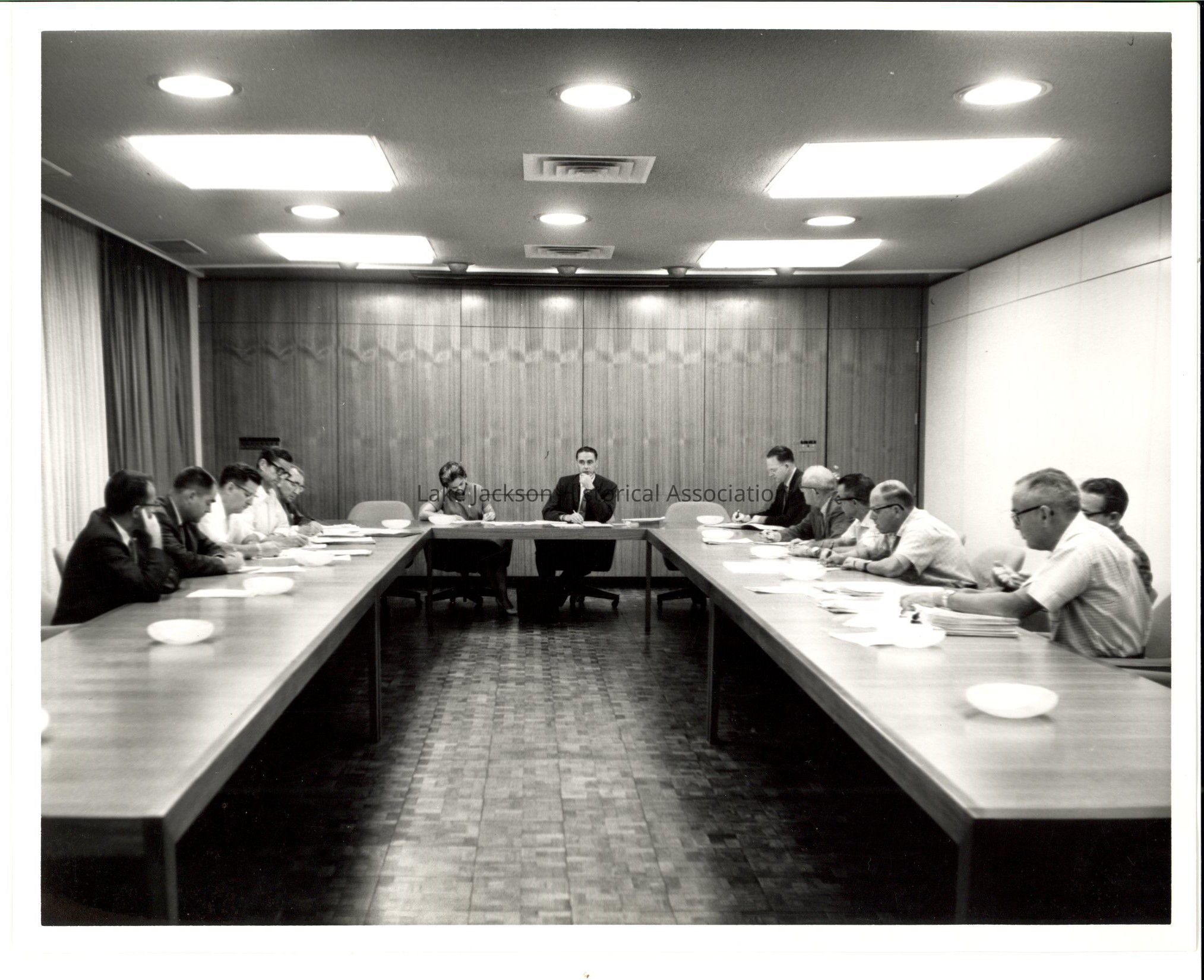 A Black & White Photo of people sitting around tables in a staff meeting, with Earle Barnes at head of tables.Collection