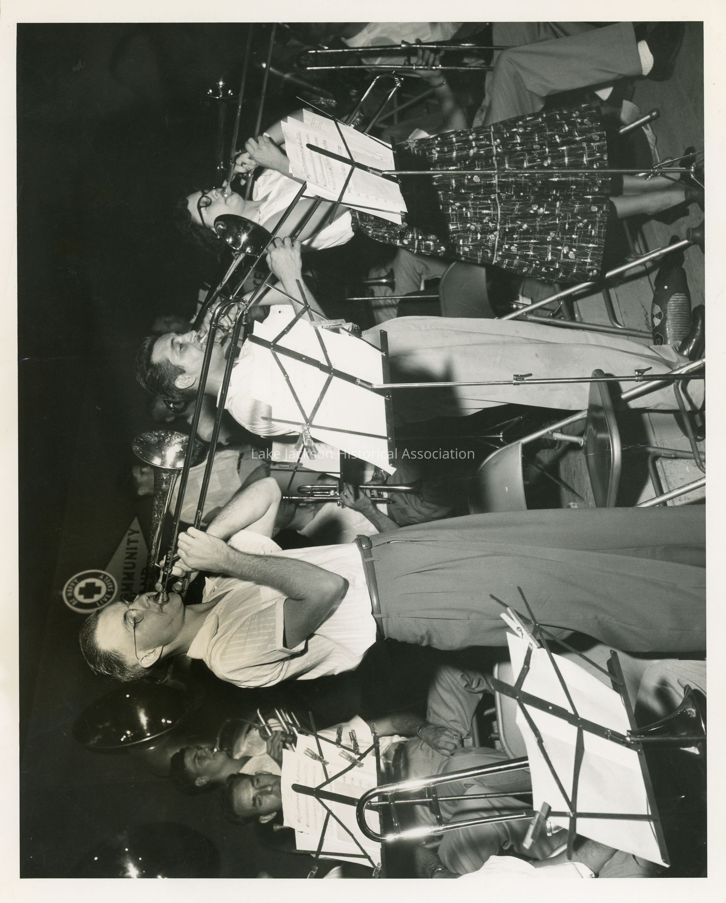 A Black & White Photo of Dow Community Band in concert. Shows 3 members of the trombone section performing.Collection