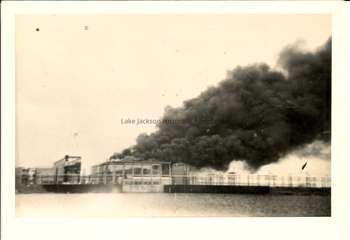 A Black & White Photo of a power house fire. Back of photo reads: "July 14, 1941; 8:36 a.m.; power house fire.Collection