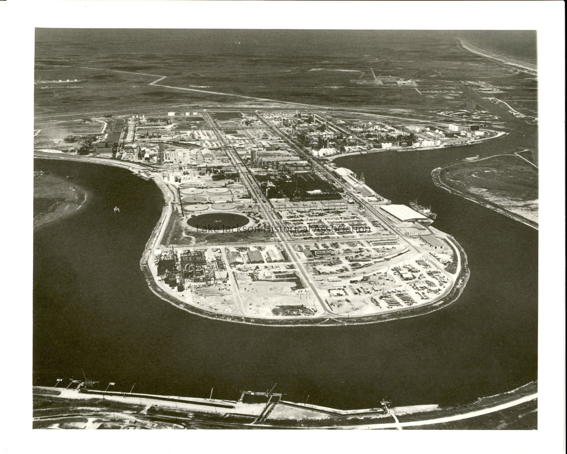 A black & white aerial photo of Dow Chemical Plant A. Back of photo reads: "Dow Plant A in Texas -- Waters of Brazos Harbor flow along three sides of Plant A in the Dow Chemical Company's Texas Division at Freeport". Dated 1967Collection