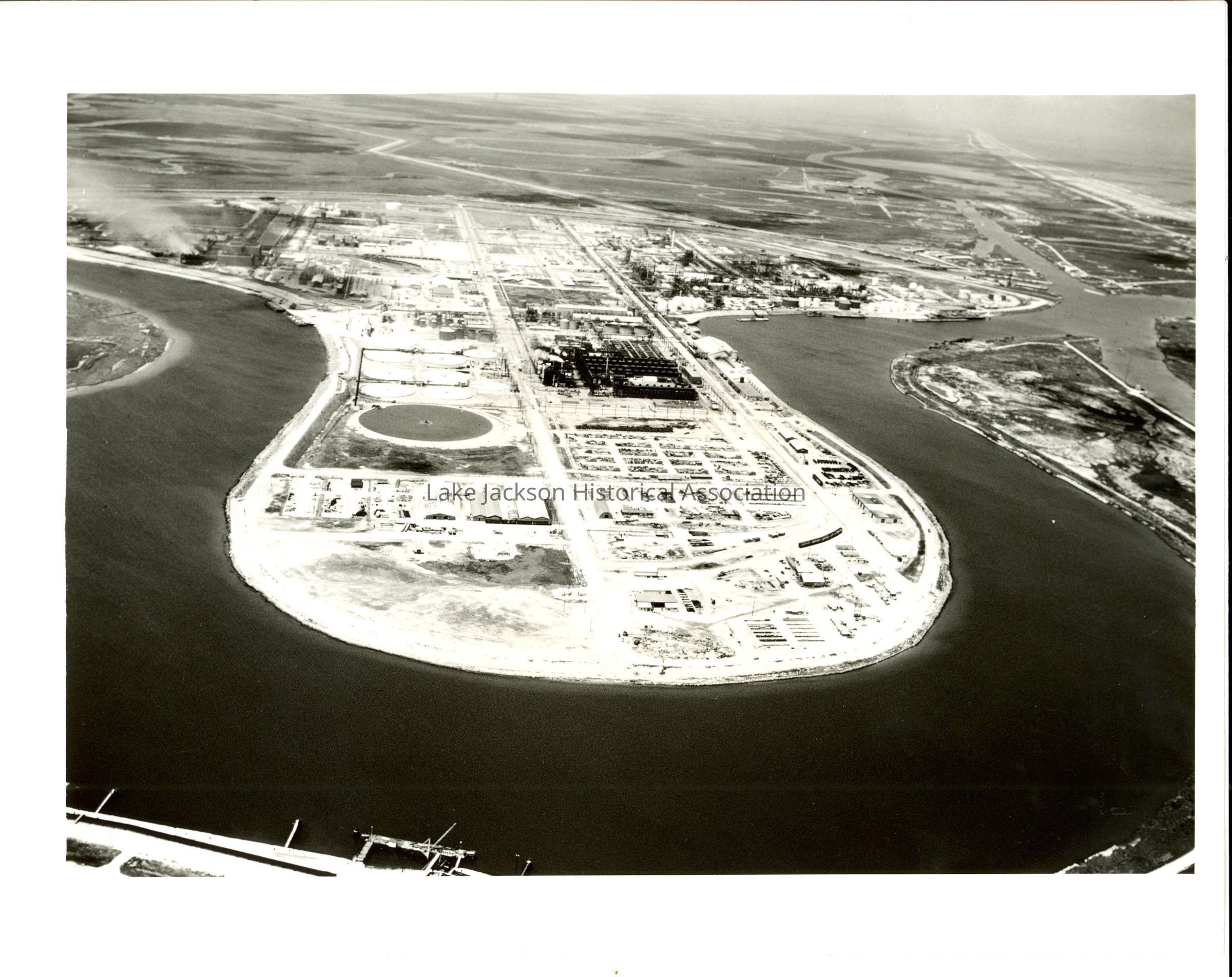 A black & white aerial photo of Dow Chemical Plant A. Back of photo reads: "Dow Plant A in Texas -- Waters of Brazos Harbor flow along three sides of Plant A in the Dow Chemical Company's Texas Division at Freeport". "Plt A early 1960's".Collection