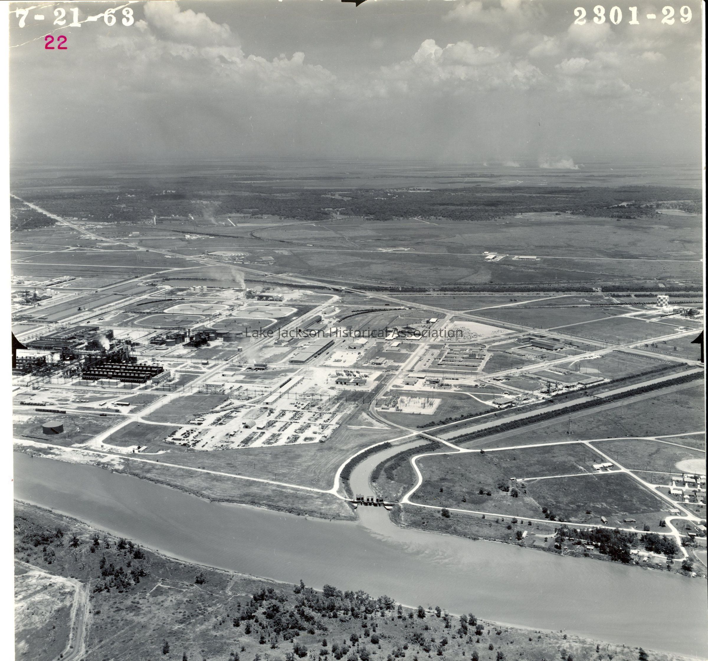 A black & white aerial photo. Back of photo reads: "Plt B showing Plt A w.w. outfall to the Brazos River".