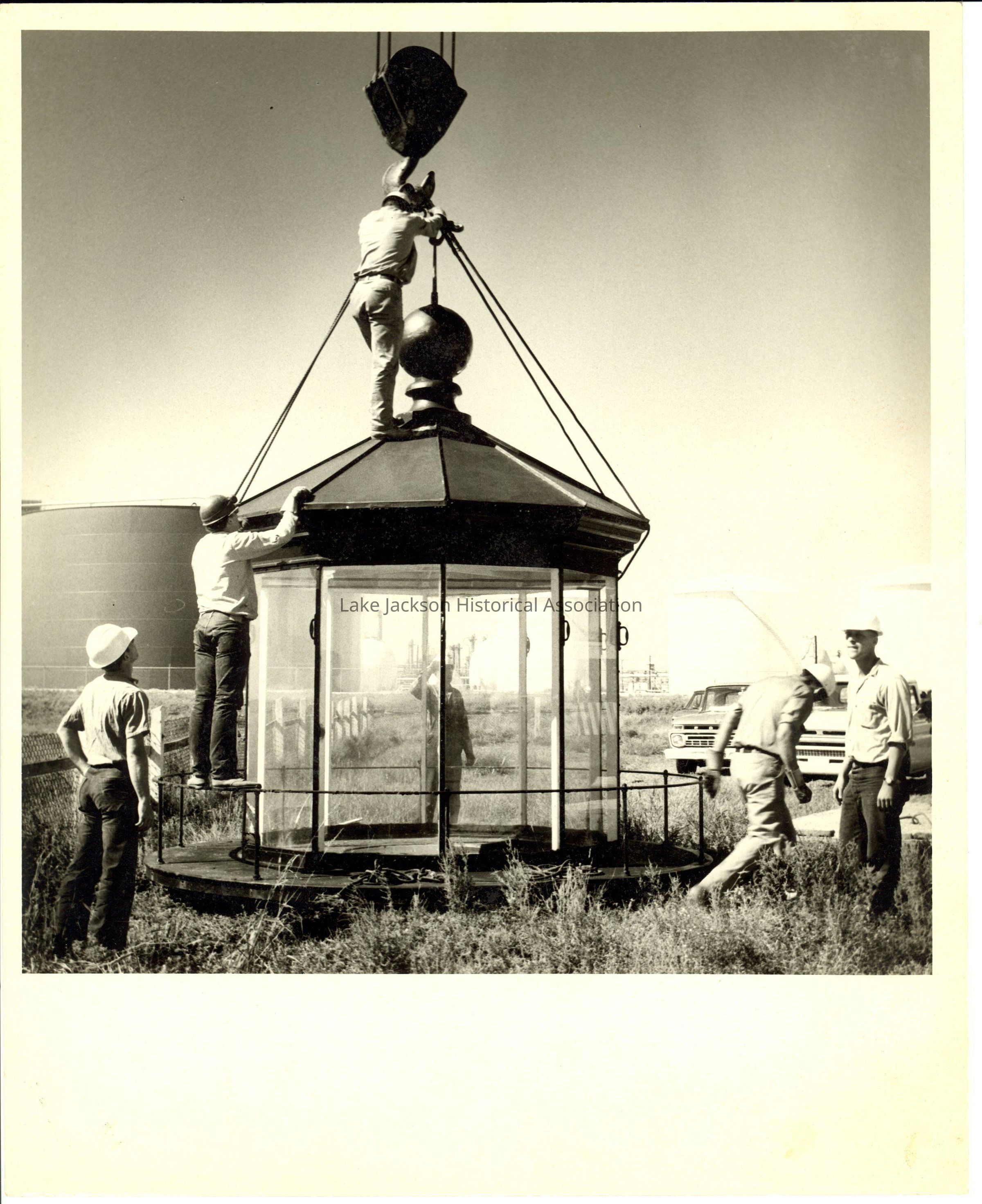 A black & white photo of the top of a light house. Back of photo reads: "Dow construction workers dismantling old light house at Plt 'A'".Collection