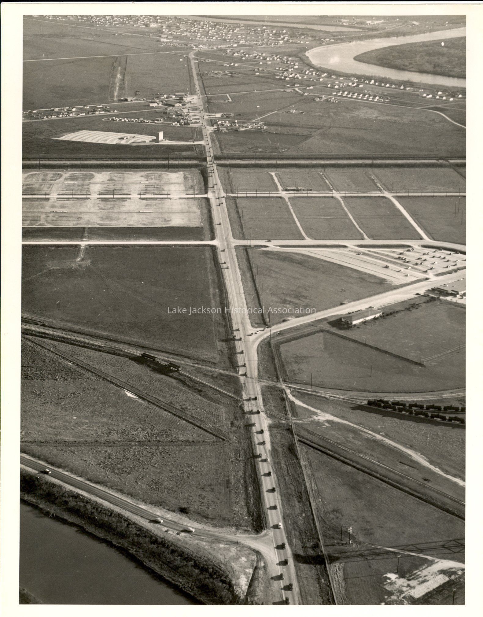 A black & white aerial photo of what appears to be Hwy 288 in front of Dow Plant B going south to Velasco. Shows curve in the Brazos River.Collection