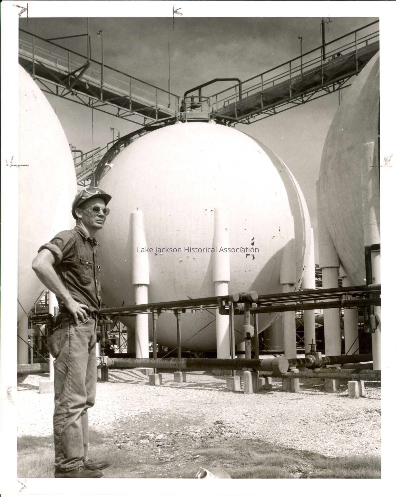 A black & white photo of a man standing in front of a round tank in one of the Dow plants.Collection