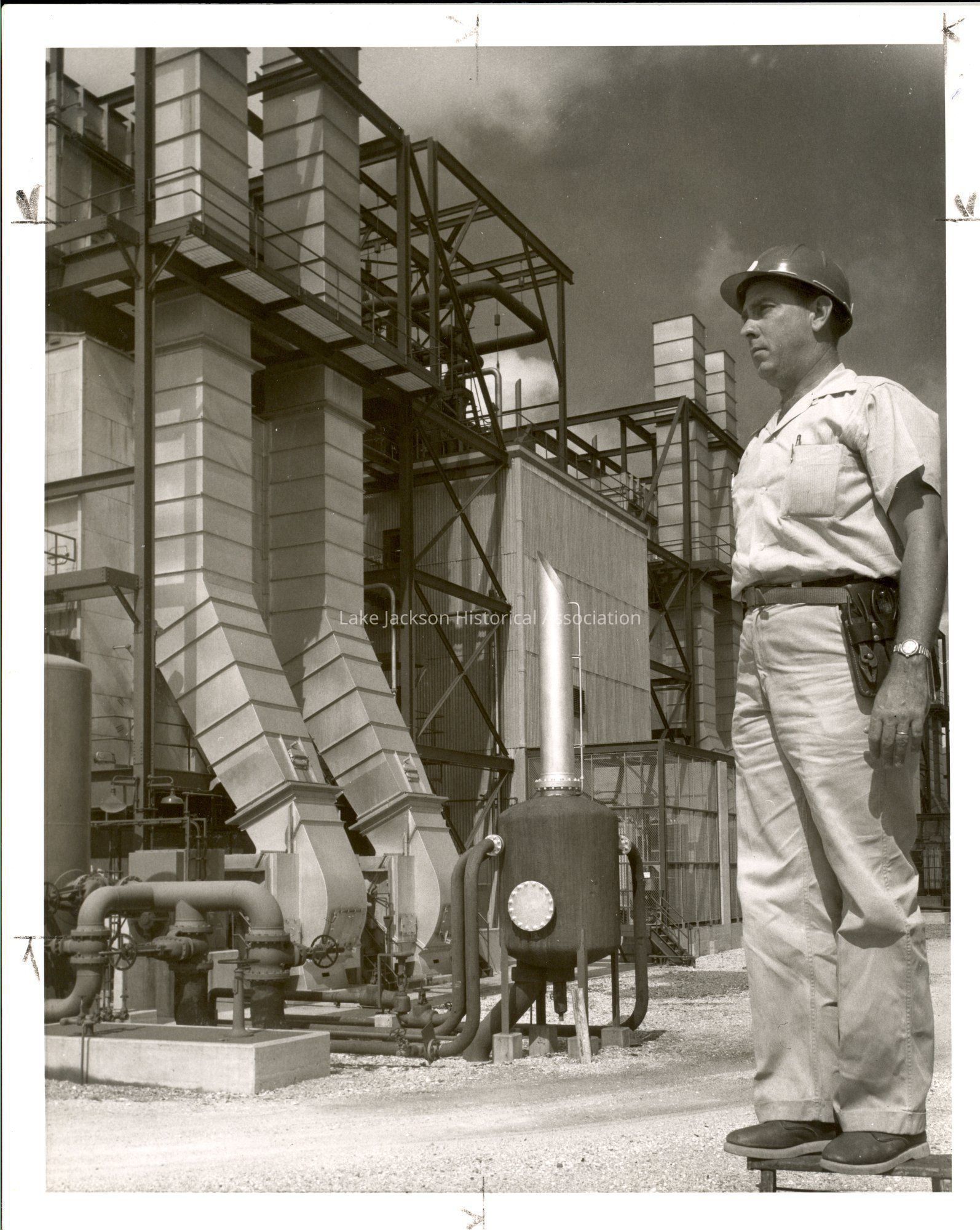 A black & white photo of a man standing in front of what appears to be a burner unit in one of the Dow plants.Collection