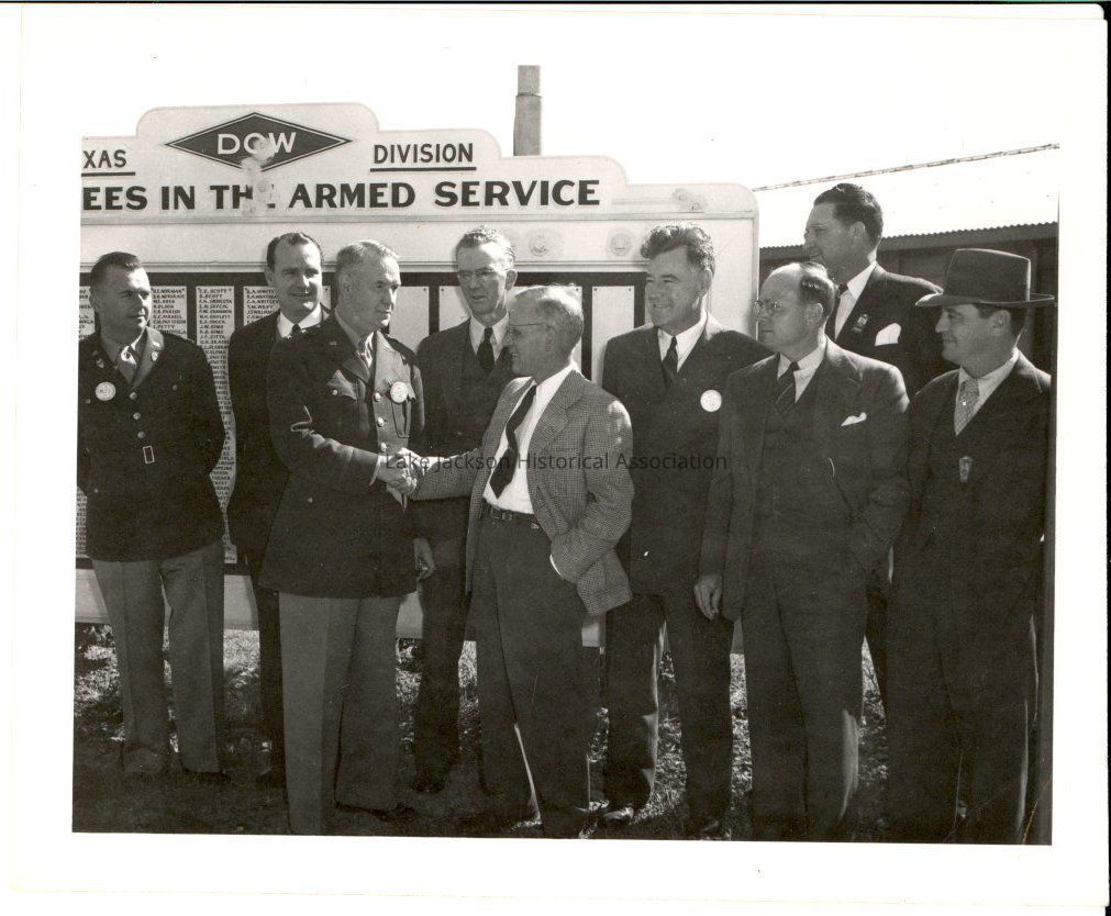 A black & white photo of Dr. A. P. Beutel, Gen. Donovan, another military man, and 6 men in suits standing in front of a sign listing Dow employees serving in the Armed Services. Back of photo reads: