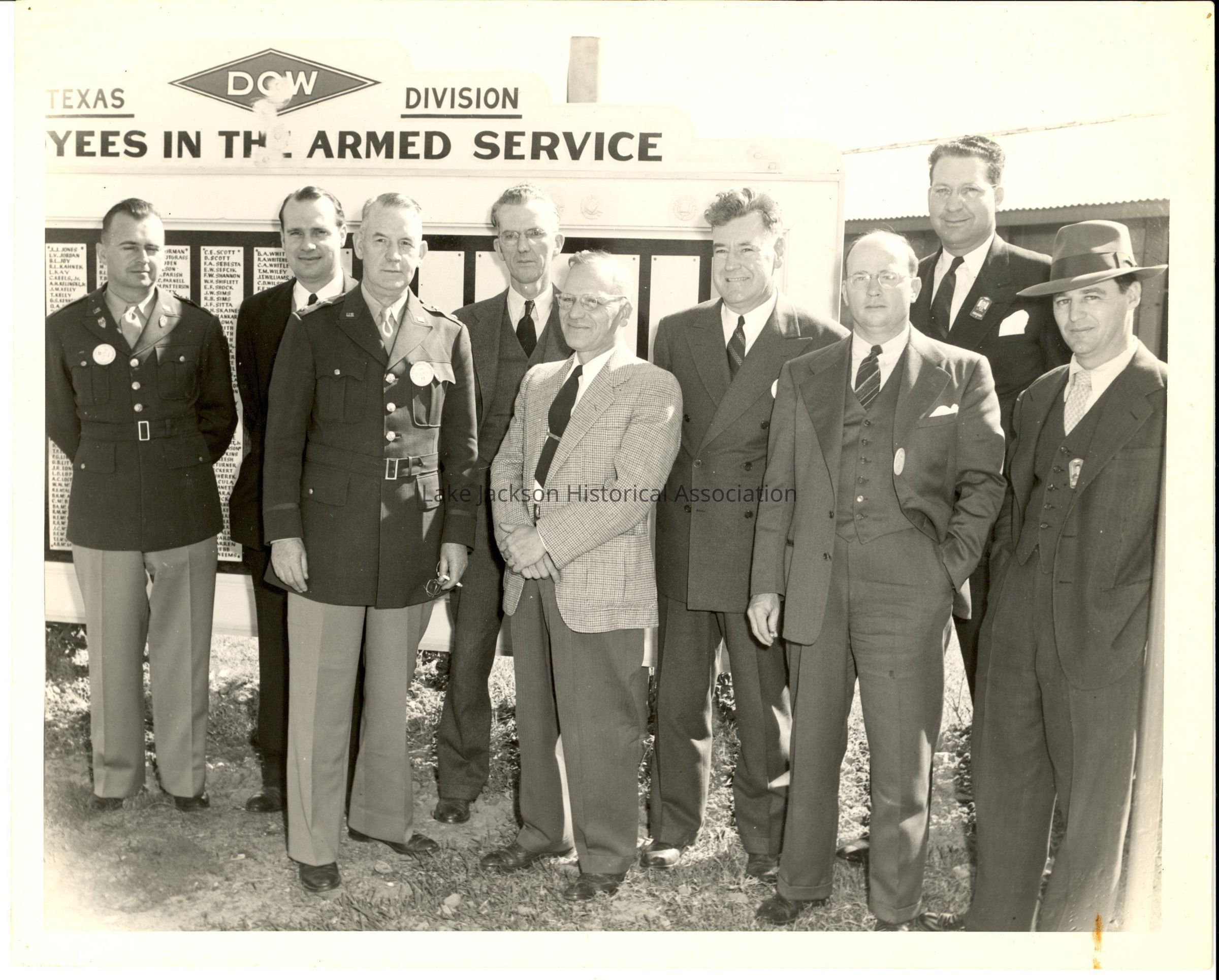 A black & white photo of Dr. A. P. Beutel, Gen. Donovan, another military man, and 6 men in suits standing in front of a sign listing Dow employees serving in the Armed Services.Collection