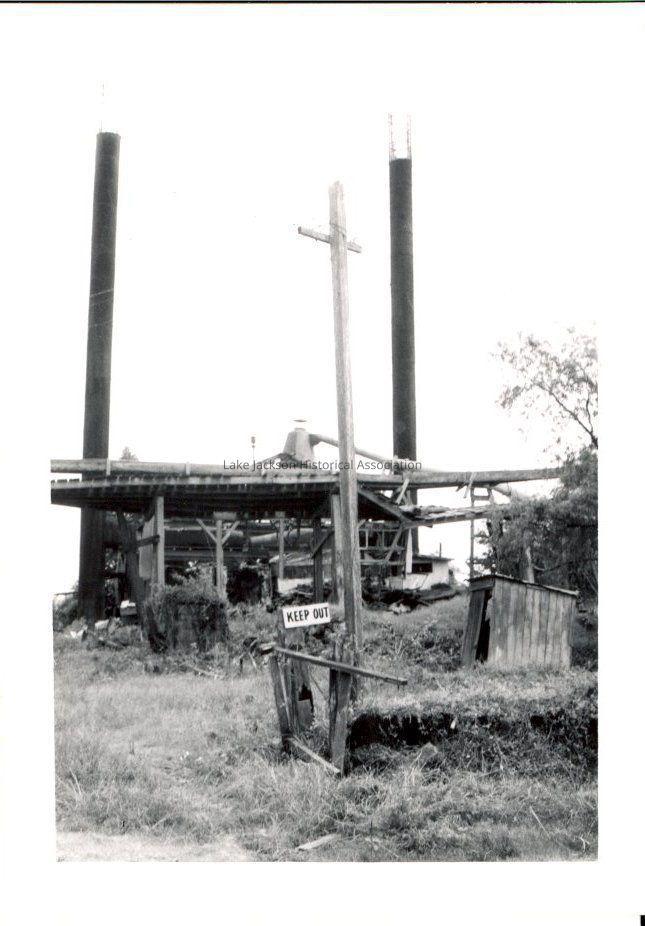 A black & white photo of a building or platform being torn down or constructed with a KEEP OUT sign.Collection