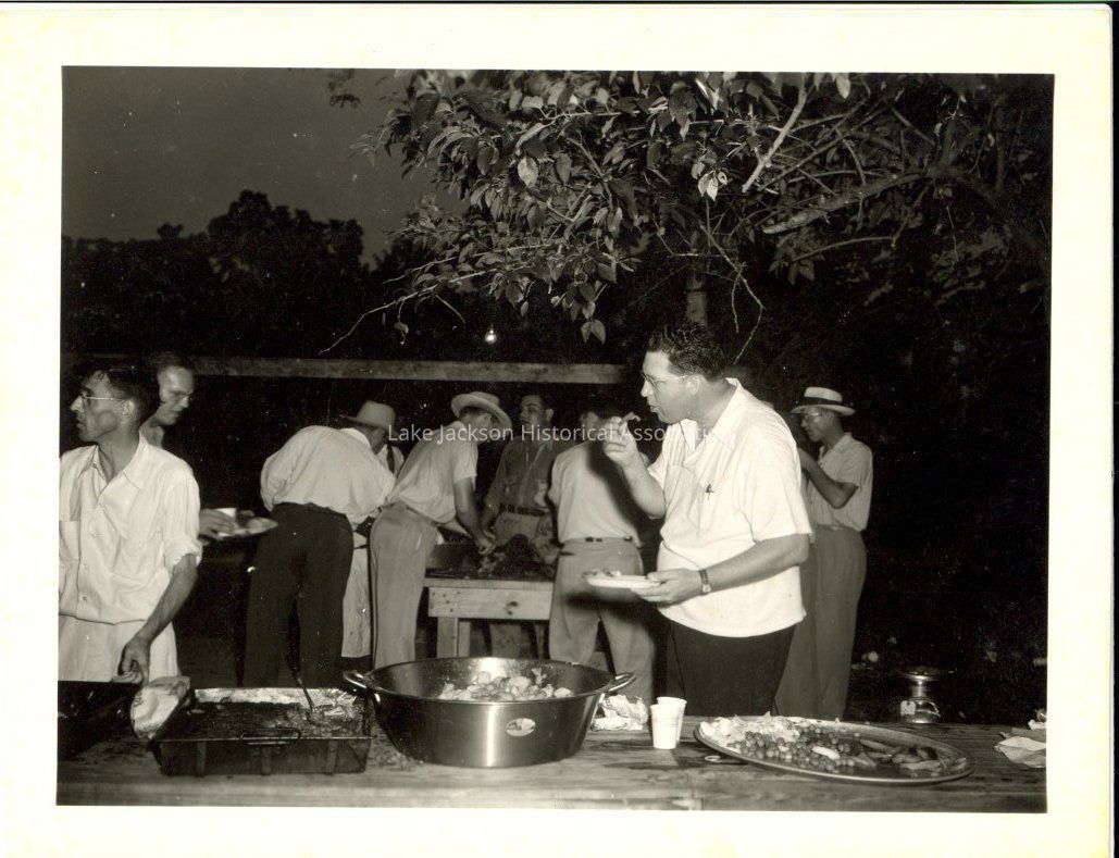 A black & white photo of some men at Dow Lake party eating from a buffetCollection