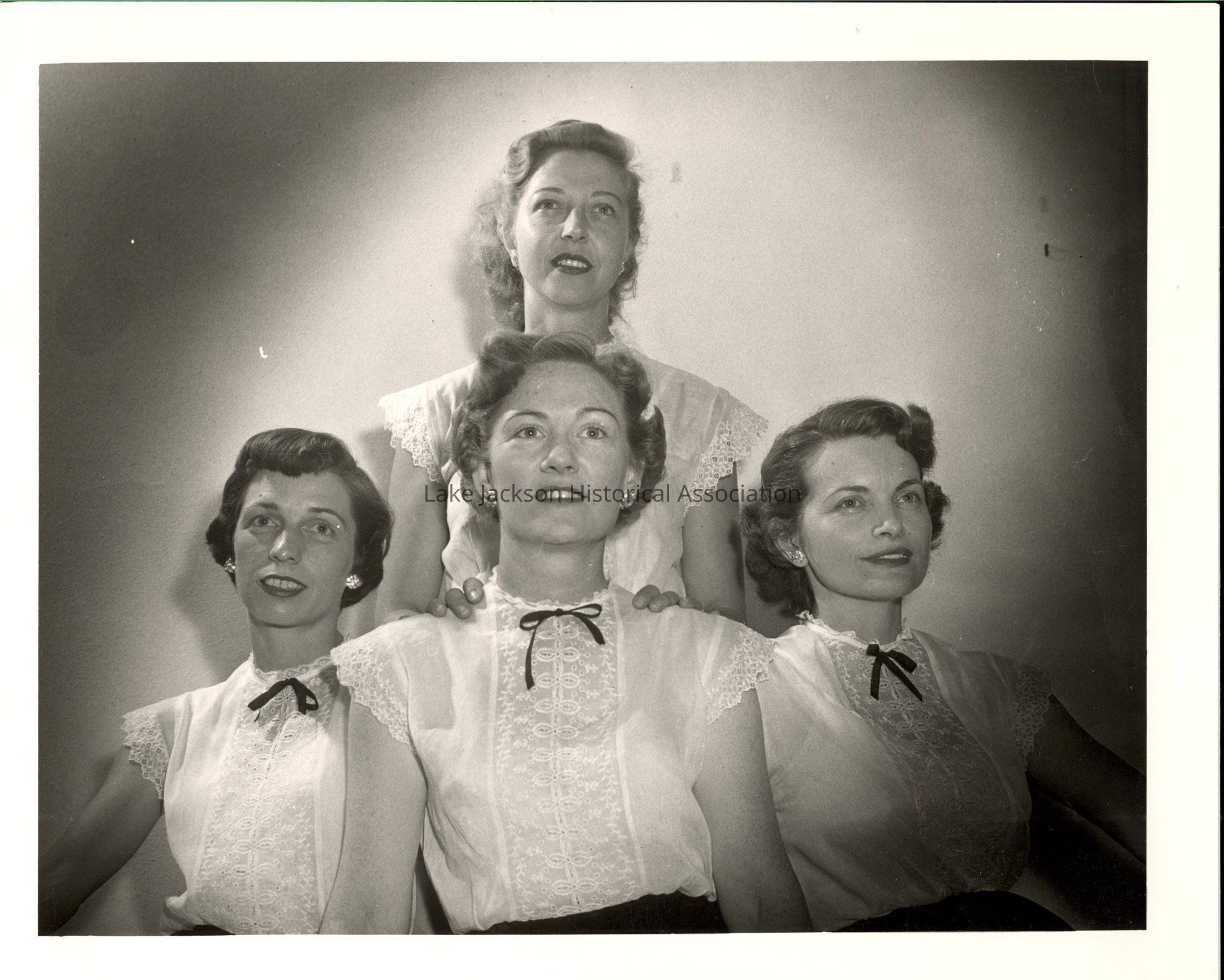 A black & white photo of four women. Appears to be a quartet. Back of photo reads: "Dorothy Braswell; Betty Walker; June Moore; Shirley Brown"Collection