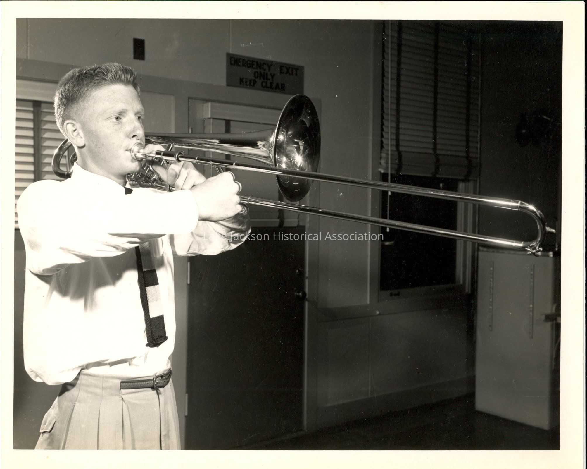 A black & white photo of an unknown young man playing a trombone.Collection