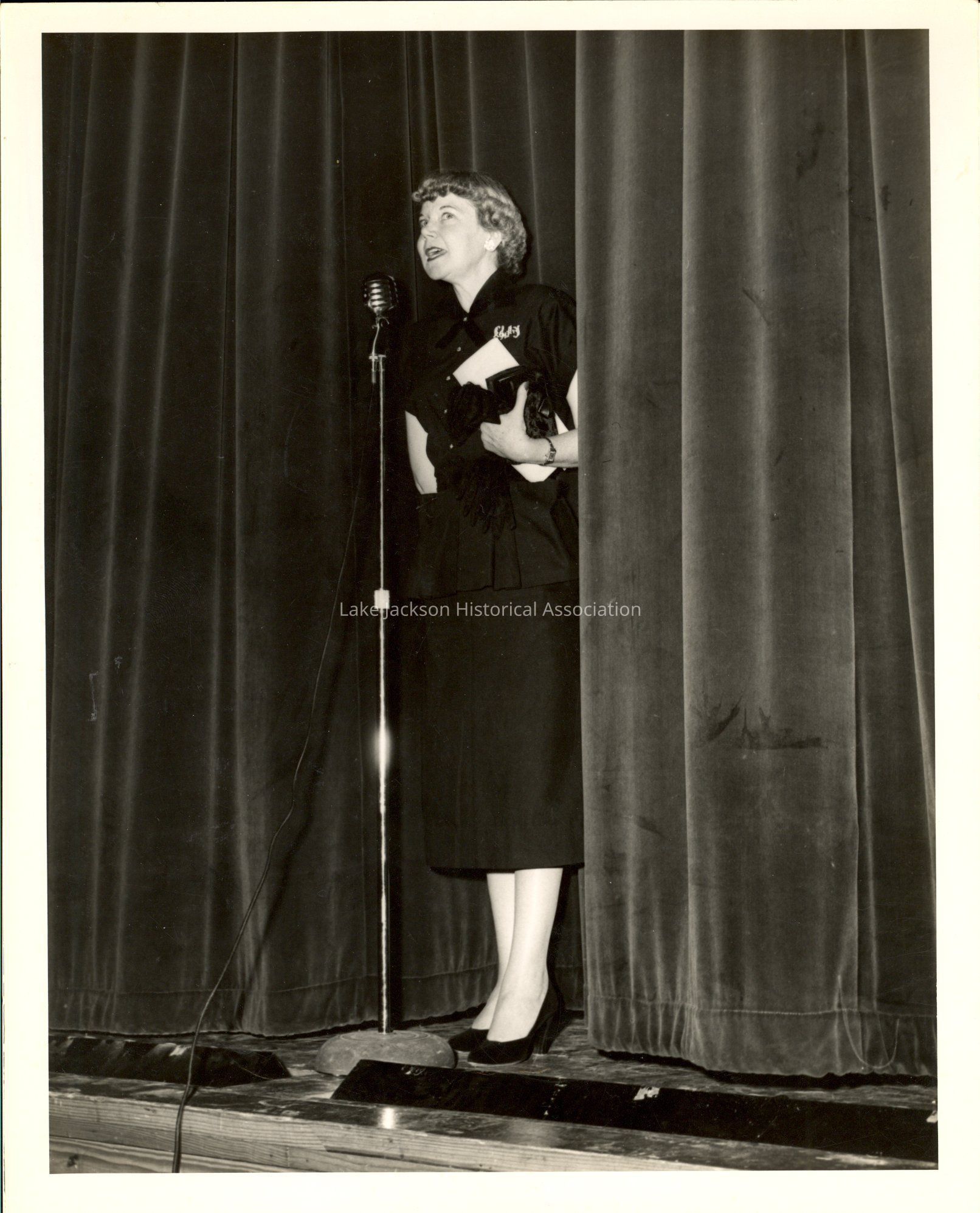 A black & white photo of a lady on stage in front of a microphone.Collection