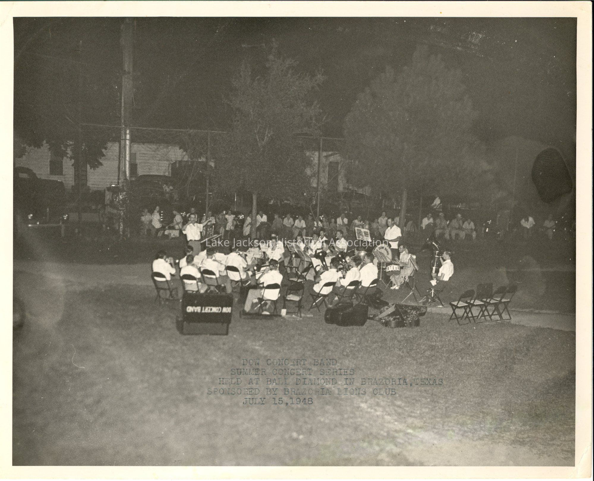 A black & white photo of families sitting in folding chairs outside at night. Photo caption reads: "Dow Concert Band Summer Concert Series Held at Ball Diamond in Brazoria, Texas sponsored by Brazoria Lions Club July 15, 1948".Collection