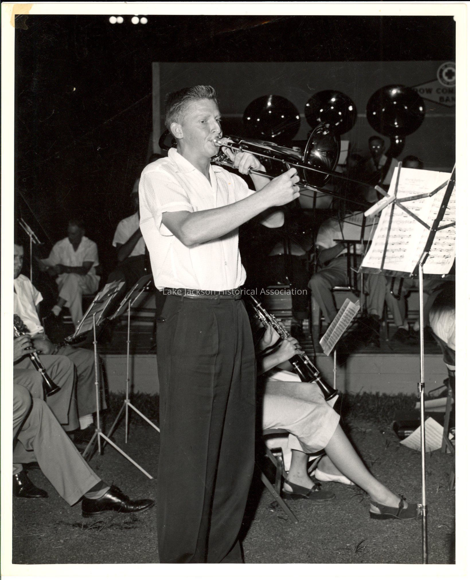 A black & white photo of a young man playing a trombone in front of a band.Collection