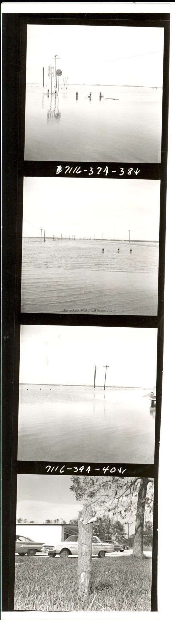 A strip of 4 black and white photo proofs. Three are pictures of what appears to be flooding after Hurricane Carla and one is a picture of a tree stump with something imbedded in it.Collection