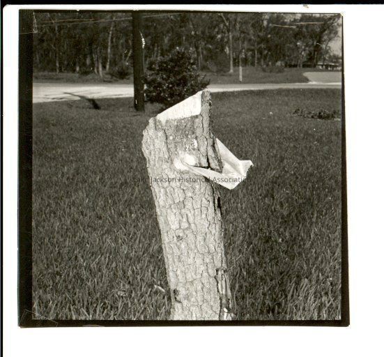 A black and white photo proof of a picture of a tree stump with something imbedded in it.Collection